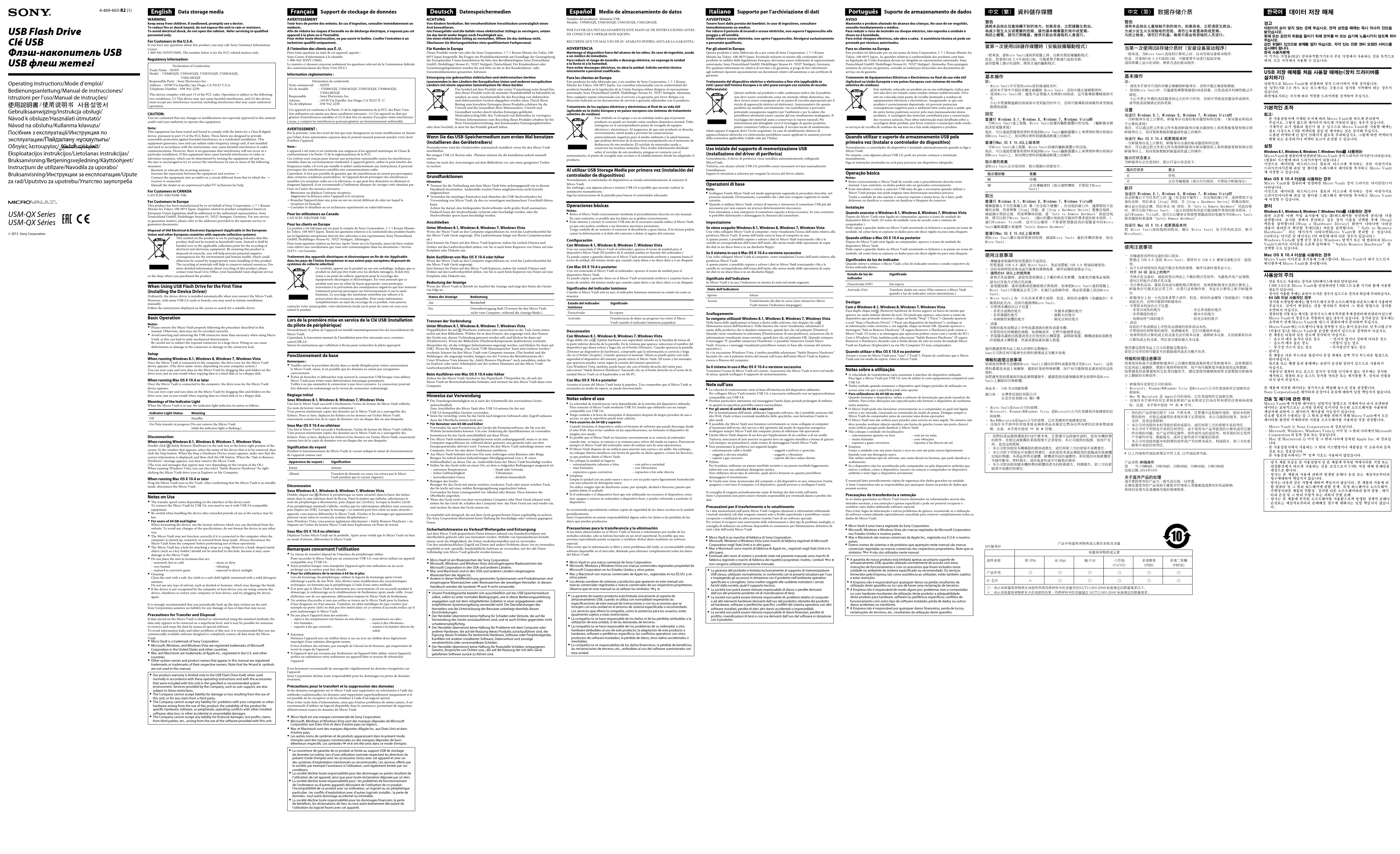 Gebruiksaanwijzing/Instrukcja obsługi/ Návod k obsluze/Használati útmutató/ Návod na obsluhu/Kullanma kılavuzu/ Посібник з експлуатації/Инструкция по эксплуатации/Пайдалану нұсқаулығы/ Οδηγίες λειτουργίας/ /Kasutusjuhend/ Eksploatacijos instrukcijos/Lietošanas instrukcijas/ Bruksanvisning/Betjeningsvejledning/Käyttöohjeet/ Instrucţiuni de utilizare/Navodila za uporabo/ Bruksanvisning/Инструкции за експлоатация/Upute za rad/Uputstvo za upotrebu/Упатство заупотреба USB Flash Drive Clé USB Флэш-накопитель USB USB флеш жетегі Data storage media WARNINGKeep away from children. If swallowed, promptly see a doctor.To reduce fire or shock hazard, do not expose the unit to rain or moisture.To avoid electrical shock, do not open the cabinet. Refer servicing to qualified personnel only.For Customers in the U.S.A.If you have any questions about this product, you may call: Sony Customer Information Center1-800-942-SONY(7669). The number below is for the FCC related matters only.Regulatory Information:Declaration of ConformityTrade Name : SONYModel : USM8GQX, USM16GQX, USM32GQX, USM64GQX, USM128GQXResponsible Party : Sony Electronics Inc.Address : 16530 Via Esprillo, San Diego, CA 92127 U.S.A.Telephone Number : 858-942-2230This device complies with part 15 of the FCC rules. Operation is subject to the following two conditions: (1) This device may not cause harmful interference, and (2) this device must accept any interference received, including interference that may cause undesired operation.CAUTION:You are cautioned that any changes or modifications not expressly approved in this manual could void your authority to operate this equipment.Note:This equipment has been tested and found to comply with the limits for a Class B digital device, pursuant to part 15 of the FCC Rules. These limits are designed to provide reasonable protection against harmful interference in a residential installation. This equipment generates, uses and can radiate radio frequency energy and, if not installed and used in accordance with the instructions, may cause harmful interference to radio communications. However, there is no guarantee that interference will not occur in a particular installation. If this equipment does cause harmful interference to radio or television reception, which can be determined by turning the equipment off and on, the user is encouraged to try to correct the interference by one or more of the following measures:Reorient or relocate the receiving antenna. ˋIncrease the separation between the equipment and receiver. ˋConnect the equipment into an outlet on a circuit different from that to which the ˋreceiver is connected.Consult the dealer or an experienced radio/TV technician for help. ˋFor Customers in CANADACAN ICES-3(B)/NMB-3(B)For Customers in EuropeThis product has been manufactured by or on behalf of Sony Corporation, 1-7-1 Konan Minato-ku Tokyo, 108-0075 Japan. Inquiries related to product compliance based on European Union legislation shall be addressed to the authorized representative, Sony Deutschland GmbH, Hedelfinger Strasse 61, 70327 Stuttgart, Germany. For any service or guarantee matters, please refer to the addresses provided in the separate service or guarantee documents.Disposal of Old Electrical & Electronic Equipment (Applicable in the European Union and other European countries with separate collection systems)This symbol on the product or on its packaging indicates that this product shall not be treated as household waste. Instead it shall be handed over to the applicable collection point for the recycling of electrical and electronic equipment. By ensuring this product is disposed of correctly, you will help prevent potential negative consequences for the environment and human health, which could otherwise be caused by inappropriate waste handling of this product. The recycling of materials will help to conserve natural resources. For more detailed information about recycling of this product, please contact your local Civic Office, your household waste disposal service or the shop where you purchased the product. When Using USB Flash Drive for the First Time (Installing the Device Driver) Ordinarily, the device driver is installed automatically when you connect the Micro Vault.However, with some USB 2.0 cards or boards, you may need to initiate installation manually.Follow the instructions displayed on the screen to search for a suitable driver. Basic Operation Notes: Please remove the Micro Vault properly following the procedure described in this ˎ manual. Otherwise, data may not be recorded correctly. Avoid inserting and removing the USB connector more than necessary when using Micro ˎ Vault, as this can lead to early mechanical deterioration. Be careful not to subject the exposed connector to a large force. Doing so can cause deformation or damage to the connector or damage to the connector lock.SetupWhen running Windows 8.1, Windows 8, Windows 7, Windows Vista Once the Micro Vault is connected to the computer, the drive icon for the Micro Vault device appears. (The drive name varies, depending on your computer system.)You can now copy and save data on the Micro Vault by dragging files and folders on the drive icon, just as you would when copying data to a hard disk or to a floppy disk.When running Mac OS X 10.4 or laterOnce the Micro Vault is connected to the computer, the drive icon for the Micro Vault device appears.You can now copy and save data on the Micro Vault by dragging files and folders on the drive icon, just as you would when copying data to a hard disk or to a floppy disk.Meanings of the Indicator LightWhen the Micro Vault is in use, the indicator light indicates its status as follows.Indicator Light Status MeaningOff StandbyOn Data transfer in progress (Do not remove the Micro Vault while the in
