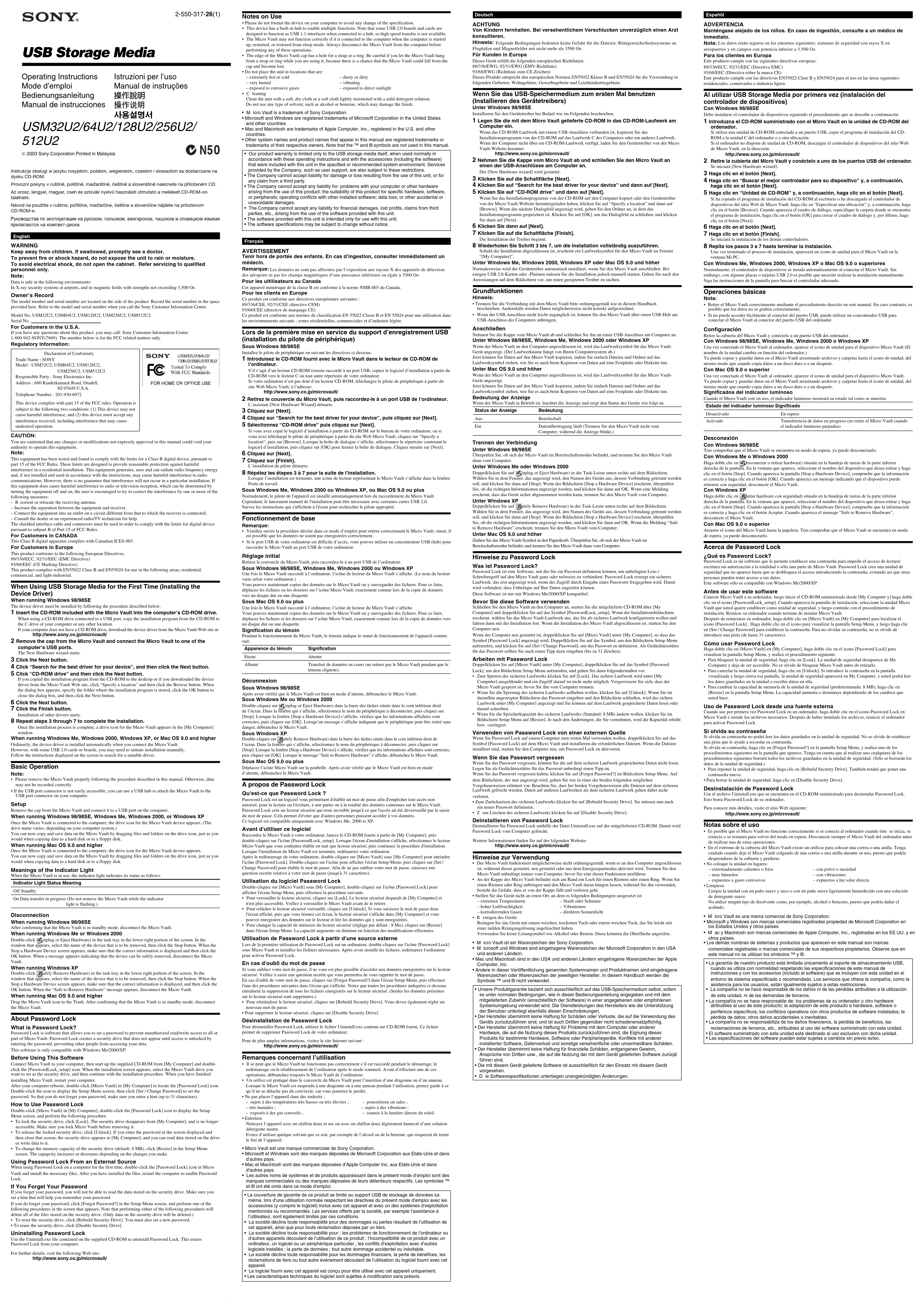 Français AVERTISSEMENT Tenir hors de portée des enfants. En cas d’ingestion, consulter immédiatement unmédecin.Remarque: Les données ne sont pas affectées par l’exposition aux rayons X des appareils de détectiondes aéroports ni par les champs magnétiques d’une puissance inférieure ou égale à 3500 Oe.Pour les ultilisateurs au CanadaCet appareil numérique de la classe B est conforme à la norme NMB-003 du Canada.Pour les clients en EuropeCe produit est conforme aux directives européennes suivantes :89/336/CEE, 92/31/CEE (directive CEM)93/68/CEE (directive de marquage CE)Ce produit est conforme aux normes de classification EN 55022 Classe B et EN 55024 pour une utilisation dansles environnements suivants : zones résidentielles, commerciales et d’industrie légère. Lors de la première mise en service du support d’enregistrement USB (installation du pilote de périphérique) Sous Windows 98/98SEInstallez le pilote de périphérique en suivant les directives ci-dessous. 1 Introduisez le CD-ROM fourni avec le Micro Vault dans le lecteur de CD-ROM de l’ordinateur.S’il s’agit d’un lecteur CD-ROM externe raccordé à un port USB, copiez le logiciel d’installation à partir duCD-ROM vers le lecteur C ou tout autre répertoire de votre ordinateur.Si votre ordinateur n’est pas doté d’un lecteur CD-ROM, téléchargez le pilote de périphérique à partir dusite Web Micro Vault, à l’adresse:http://www.sony.co.jp/microvault/ 2 Retirez le couvercle du Micro Vault, puis raccordez-le à un port USB de l’ordinateur. L’assistant [New Hardware Wizard] démarre. 3 Cliquez sur [Next]. 4 Cliquez sur “Search for the best driver for your device”, puis cliquez sur [Next]. 5 Sélectionnez “CD-ROM drive” puis cliquez sur [Next]. Si vous avez copié le logiciel d’installation à partir du CD-ROM sur le bureau de votre ordinateur, ou sivous avez téléchargé le pilote de périphérique à partir du site Web Micro Vault, cliquez sur “Specify alocation”, puis sur [Browse]. Lorsque la boîte de dialogue s’affiche, sélectionnez le répertoire contenant lelogiciel d’installation, puis cliquez sur [OK] pour fermer la boîte de dialogue. Cliquez ensuite sur [Next]. 6 Cliquez sur [Next]. 7 Cliquez sur [Finish]. L’installation du pilote démarre. 8 Répétez les étapes 3 à 7 pour la suite de l’installation. Lorsque l’installation est terminée, une icône de lecteur représentant le Micro Vault s’affiche dans la fenêtrePoste de travail.Sous Windows Me, Windows 2000 ou Windows XP, ou Mac OS 9.0 ou plusNormalement, le pilote de l'appareil est installé automatiquement lors du raccordement du Micro Vault.Cependant, le lancement manuel de l'installation peut être nécessaire avec certaines cartes USB 2.0.Suivez les instructions qui s'affichent à l'écran pour rechercher le pilote approprié. Fonctionnement de base Remarque: