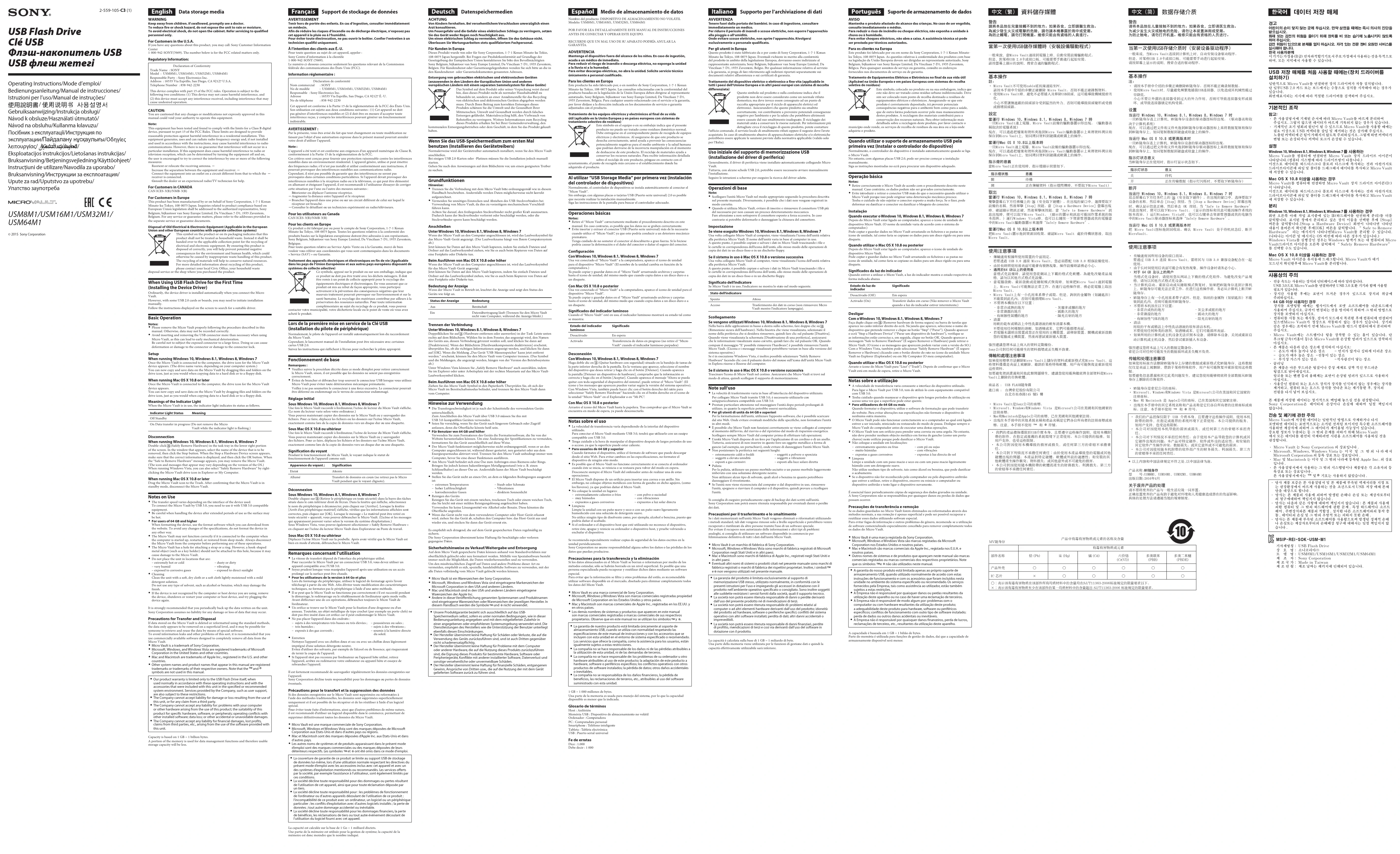 symbols are not used in this manual. Our product warranty is limited only to the USB Flash Drive itself, when ˎ used normally in accordance with these operating instructions and with the accessories that were included with this unit in the specified or recommended system environment. Services provided by the Company, such as user support, are also subject to these restrictions. The Company cannot accept liability for damage or loss resulting from the use of ˎ this unit, or for any claim from a third party. The Company cannot accept any liability for: problems with your computer ˎ or other hardware arising from the use of this product; the suitability of this product for specific hardware, software, or peripherals; operating conflicts with other installed software; data loss; or other accidental or unavoidable damages. The Company cannot accept any liability for financial damages, lost profits, ˎ claims from third parties, etc., arising from the use of the software provided with this unit.Capacity is based on 1 GB = 1 billion bytes.A portion of the memory is used for data management functions and therefore usable storage capacity will be less. Support de stockage de données AVERTISSEMENTTenir hors de portée des enfants. En cas d’ingestion, consulter immédiatement un médecin.Afin de réduire les risques d’incendie ou de décharge électrique, n’exposez pas cet appareil à la pluie ou à l’humidité.Pour éviter toute électrocution, ne pas ouvrir le boîtier. Confier l’entretien à un technicien qualifié uniquement.À l’intention des clients aux É.-U.Pour toute question au sujet de cet appareil, appeler :Sony Centre d’information à la clientèle 1-800-942-SONY (7669).Le numéro ci-dessous concerne seulement les questions relevant de la Commission fédérale des communications des États-Unis (FCC).Information réglementaire :Déclaration de conformitéNom commercial : SONYNo de modèle : USM8M1, USM16M1, USM32M1, USM64M1Responsable : Sony Electronics Inc.Adresse : 16535 Via Esprillo, San Diego, CA 92127 É.-U.No de téléphone : 858-942-2230Cet appareil est conforme à la Partie 15 de la réglementation de la FCC des États-Unis. Son utilisation est sujette aux deux conditions suivantes : (1) Cet appareil ne doit pas générer d’interférences nuisibles et (2) il doit être en mesure d’accepter toute interférence reçue, y compris les interférences pouvant générer un fonctionnement indésirable.AVERTISSEMENT :Par la présente, vous êtes avisé du fait que tout changement ou toute modification ne faisant pas l’objet d’une autorisation expresse dans le présent manuel pourrait annuler votre droit d’utiliser l’appareil.Note :L’appareil a été testé et est conforme aux exigences d’un appareil numérique de Classe B, conformément à la Partie 15 de la réglementation de la FCC.Ces critères sont conçus pour fournir une protection raisonnable contre les interférences nuisibles dans un environnement résidentiel. L’appareil génère, utilise et peut émettre des fréquences radio; s’il n’est pas installé et utilisé conformément aux instructions, il pourrait provoquer des interférences nuisibles aux communications radio.Cependant, il n’est pas possible de garantir que des interférences ne seront pas provoquées dans certaines conditions particulières. Si l’appareil devait provoquer des interférences nuisibles à la réception radio ou à la télévision, ce qui peut être démontré en allumant et éteignant l’appareil, il est recommandé à l’utilisateur d’essayer de corriger cette situation par l’une ou l’autre des mesures suivantes :Réorienter ou déplacer l’antenne réceptrice. ˋ Augmenter la distance entre l’appareil et le récepteur. ˋ Brancher l’appareil dans une prise ou sur un circuit différent de celui sur lequel le ˋ récepteur est branché. Consulter le détaillant ou un technicien expérimenté en radio/téléviseurs. ˋ Pour les utilisateurs au CanadaCAN ICES-3(B)/NMB-3(B)Pour les clients en Europe Ce produit a été fabriqué par ou pour le compte de Sony Corporation, 1-7-1 Konan Minato-ku Tokyo, 108-0075 Japon. Toutes les questions relatives à la conformité des produits basées sur la législation européenne doivent être adressées à son représentant, Sony Belgium, bijkantoor van Sony Europe Limited, Da Vincilaan 7-D1, 1935 Zaventem, Belgique. Pour toute question relative au Service Après-Vente ou à la Garantie, merci de bien vouloir vous référer aux coordonnées qui vous sont communiquées dans les documents « Service (SAV) » ou Garantie.Traitement des appareils électriques et électroniques en fin de vie (Applicable dans les pays de l’Union Européenne et aux autres pays européens disposant de systèmes de collecte sélective)Ce symbole, apposé sur le produit ou sur son emballage, indique que ce produit ne doit pas être traité avec les déchets ménagers. Il doit être remis à un point de collecte approprié pour le recyclage des équipements électriques et électroniques. En vous assurant que ce produit est mis au rebut de façon appropriée, vous participez activement à la prévention des conséquences négatives que leur mauvais traitement pourrait provoquer sur l’environnement et sur la santé humaine. Le recyclage des matériaux contribue par ailleurs à la préservation des ressources naturelles. Pour toute information complémentaire au sujet du recyclage de ce produit, vous pouvez contacter votre municipalité, votre déchetterie locale ou le point de vente où vous avez acheté le produit.Lors de la première mise en service de la Clé USB (installation du pilote de périphérique) Normalement, le pilote de l’appareil est installé automatiquement lors du raccordement du Micro Vault. Cependant, le lancement manuel de l’installation peut être nécessaire avec certaines cartes USB 2.0. Suivez les instructions qui s’affichent à l’écran pour rechercher 
