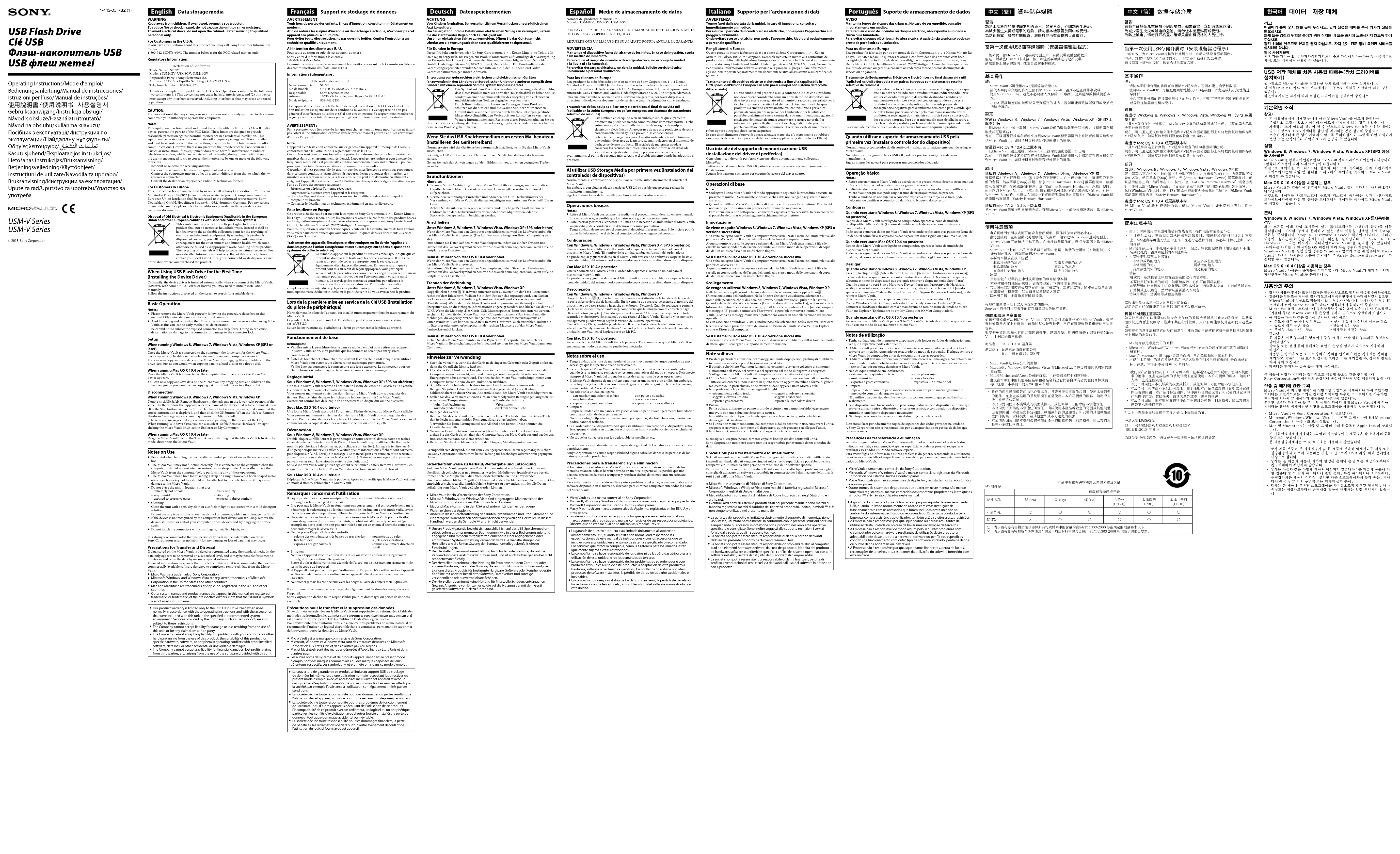 hot. The Micro Vault may not function correctly if it is connected to the computer when the computer is started up, restarted, or restored from sleep mode. Always disconnect the Micro Vault from the computer before performing any of these operations.The Micro Vault has a hole for attaching a strap or a ring. However, a hook-shaped metal object (such as a key holder) should not be attached to this hole, because it may cause damage to the Micro Vault.Do not place the unit in locations that are: – extremely hot or cold – dusty or dirty– very humid – vibrating– exposed to corrosive gases – exposed to direct sunlightCleaning Clean the unit with a soft, dry cloth or a soft cloth lightly moistened with a mild detergent solution. Do not use any type of solvent, such as alcohol or benzene, which may damage the finish.If the device is not recognized by the computer or host device you are using, remove the device, shutdown or restart your computer or host device, and try plugging the device again.Do not touch the connectors with your fingers, metallic objects, etc. It is strongly recommended that you periodically back up the data written on the unit.Sony Corporation assumes no liability for any damage or loss of data that may occur.Precautions for Transfer and DisposalIf data stored on the Micro Vault is deleted or reformatted using the standard methods, the data only appears to be removed on a superficial level, and it may be possible for someone to retrieve and reuse the data by means of special software.To avoid information leaks and other problems of this sort, it is recommended that you use commercially available software designed to completely remove all data from the Micro Vault.Micro Vault is a trademark of Sony Corporation. Microsoft, Windows, and Windows Vista are registered trademarks of Microsoft Corporation in the United States and other countries.Mac and Macintosh are trademarks of Apple Inc., registered in the U.S. and other countries.Other system names and product names that appear in this manual are registered trademarks or trademarks of their respective owners. Note that the and symbols are not used in this manual.Our product warranty is limited only to the USB Flash Drive itself, when used normally in accordance with these operating instructions and with the accessories that were included with this unit in the specified or recommended system environment. Services provided by the Company, such as user support, are also subject to these restrictions.The Company cannot accept liability for damage or loss resulting from the use of this unit, or for any claim from a third party.The Company cannot accept any liability for: problems with your computer or other hardware arising from the use of this product; the suitability of this product for specific hardware, software, or peripherals; operating conflicts with other installed software; data loss; or other accidental or unavoidable damages.The Company cannot accept any liability for financial damages, lost profits, claims from third parties, etc., arising from the use of the software provided with this unit. Support de stockage de données AVERTISSEMENTTenir hors de portée des enfants. En cas d’ingestion, consulter immédiatement un médecin.Afin de réduire les risques d’incendie ou de décharge électrique, n’exposez pas cet appareil à la pluie ou à l’humidité.Pour éviter toute électrocution, ne pas ouvrir le boîtier. Confier l’entretien à un technicien qualifié uniquement.À l’intention des clients aux É.-U.Pour toute question au sujet de cet appareil, appeler :Sony Centre d’information à la clientèle 1-800-942-SONY (7669).Le numéro ci-dessous concerne seulement les questions relevant de la Commission fédérale des communications des États-Unis (FCC).Information réglementaire :Déclaration de conformitéNom commercial : SONYNo de modèle : USM4GV, USM8GV, USM16GVResponsable : Sony Electronics Inc.Adresse : 16530 Via Esprillo, San Diego, CA 92127 É.-U.No de téléphone : 858-942-2230Cet appareil est conforme à la Partie 15 de la réglementation de la FCC des États-Unis. Son utilisation est sujette aux deux conditions suivantes : (1) Cet appareil ne doit pas générer d’interférences nuisibles et (2) il doit être en mesure d’accepter toute interférence reçue, y compris les interférences pouvant générer un fonctionnement indésirable.AVERTISSEMENT :Par la présente, vous êtes avisé du fait que tout changement ou toute modification ne faisant pas l’objet d’une autorisation expresse dans le présent manuel pourrait annuler votre droit d’utiliser l’appareil.Note :L’appareil a été testé et est conforme aux exigences d’un appareil numérique de Classe B, conformément à la Partie 15 de la réglementation de la FCC.Ces critères sont conçus pour fournir une protection raisonnable contre les interférences nuisibles dans un environnement résidentiel. L’appareil génère, utilise et peut émettre des fréquences radio; s’il n’est pas installé et utilisé conformément aux instructions, il pourrait provoquer des interférences nuisibles aux communications radio.Cependant, il n’est pas possible de garantir que des interférences ne seront pas provoquées dans certaines conditions particulières. Si l’appareil devait provoquer des interférences nuisibles à la réception radio ou à la télévision, ce qui peut être démontré en allumant et éteignant l’appareil, il est recommandé à l’utilisateur d’essayer de corriger cette situation par l’une ou l’autre des mesures suivantes :Réorienter ou déplacer l’antenne réceptrice. ˋAugmenter la distance entre l’appareil et le récepteur. ˋ Brancher l’appareil dans une prise ou sur un circuit différent de celui sur lequel le ˋ récepteur est branché. Consulter le détaillant ou un technicien expérimenté en radio/téléviseurs. ˋ Pour les clients en EuropeCe produit a été fabriqué par ou po
