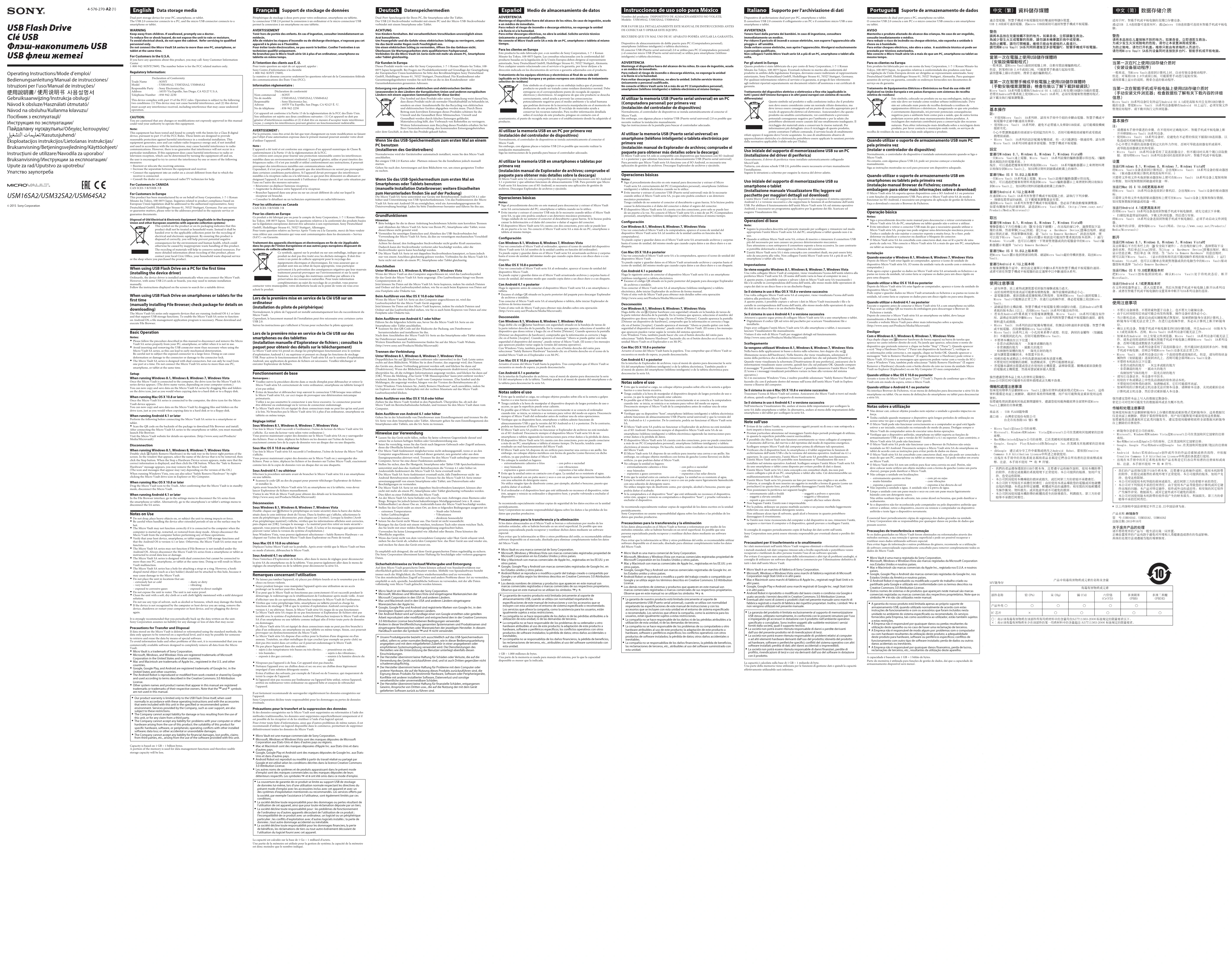 Gebruiksaanwijzing/Instrukcja obsługi/ Návod k obsluze/Használati útmutató/ Návod na obsluhu/Kullanma kılavuzu/ Посібник з експлуатації/ Инструкция по эксплуатации/ Пайдалану нұсқаулығы/Οδηγίες λειτουργίας/ /Kasutusjuhend/ Eksploatacijos instrukcijos/Lietošanas instrukcijas/ Bruksanvisning/Betjeningsvejledning/Käyttöohjeet/ Instrucţiuni de utilizare/Navodila za uporabo/ Bruksanvisning/Инструкции за експлоатация/ Upute za rad/Uputstvo za upotrebu/ Упатство заупотреба USB Flash Drive Clé USB Флэш-накопитель USB USB флеш жетегі Data storage media Dual port storage device for your PC, smartphone, or tablet.The USB 2.0 connector connects to a PC, and the micro USB connector connects to a smartphone or tablet.WARNINGKeep away from children. If swallowed, promptly see a doctor.To reduce fire or shock hazard, do not expose the unit to rain or moisture.To avoid electrical shock, do not open the cabinet. Refer servicing to qualified personnel only.Do not connect the Micro Vault SA series to more than one PC, smartphone, or tablet at the same time.For Customers in the U.S.A.If you have any questions about this product, you may call: Sony Customer Information Center1-800-942-SONY(7669). The number below is for the FCC related matters only.Regulatory Information:Declaration of ConformityTrade Name : SONYModel : USM16SA2, USM32SA2, USM64SA2Responsible Party : Sony Electronics Inc.Address : 16535 Via Esprillo, San Diego, CA 92127 U.S.A.Telephone Number : 858-942-2230This device complies with part 15 of the FCC rules. Operation is subject to the following two conditions: (1) This device may not cause harmful interference, and (2) this device must accept any interference received, including interference that may cause undesired operation.CAUTION:You are cautioned that any changes or modifications not expressly approved in this manual could void your authority to operate this equipment.Note:This equipment has been tested and found to comply with the limits for a Class B digital device, pursuant to part 15 of the FCC Rules. These limits are designed to provide reasonable protection against harmful interference in a residential installation. This equipment generates, uses and can radiate radio frequency energy and, if not installed and used in accordance with the instructions, may cause harmful interference to radio communications. However, there is no guarantee that interference will not occur in a particular installation. If this equipment does cause harmful interference to radio or television reception, which can be determined by turning the equipment off and on, the user is encouraged to try to correct the interference by one or more of the following measures: Reorient or relocate the receiving antenna. ˋ Increase the separation between the equipment and receiver. ˋ Connect the equipment into an outlet on a circuit different from that to which the ˋ receiver is connected. Consult the dealer or an experienced radio/TV technician for help. ˋ For Customers in CANADACAN ICES-3 B/NMB-3 BFor Customers in EuropeThis product has been manufactured by or on behalf of Sony Corporation, 1-7-1 Konan Minato-ku Tokyo, 108-0075 Japan. Inquiries related to product compliance based on European Union legislation shall be addressed to the authorized representative, Sony Deutschland GmbH, Hedelfinger Strasse 61, 70327 Stuttgart, Germany. For any service or guarantee matters, please refer to the addresses provided in the separate service or guarantee documents.Disposal of Old Electrical & Electronic Equipment (Applicable in the European Union and other European countries with separate collection systems)This symbol on the product or on its packaging indicates that this product shall not be treated as household waste. Instead it shall be handed over to the applicable collection point for the recycling of electrical and electronic equipment. By ensuring this product is disposed of correctly, you will help prevent potential negative consequences for the environment and human health, which could otherwise be caused by inappropriate waste handling of this product. The recycling of materials will help to conserve natural resources. For more detailed information about recycling of this product, please contact your local Civic Office, your household waste disposal service or the shop where you purchased the product. When using USB Flash Drive on a PC for the first time (installing the device driver) Ordinarily, the device driver is installed automatically when you connect the Micro Vault.However, with some USB 2.0 cards or boards, you may need to initiate installation manually.Follow the instructions displayed on the screen to search for a suitable driver. When using USB Flash Drive on smartphones or tablets for the first time (manually installing File Browser; check package for details on downloading) The Micro Vault SA series only supports devices that are running Android OS 4.1 or later and that support USB storage functions. To enable the Micro Vault SA series to function on Android OS, a file management application program is necessary. Please download and execute File Browser. Basic Operation Notes: Please follow the procedure described in this manual to disconnect and remove the Micro ˎ Vault SA series properly from your PC, smartphone, or tablet when it is not in use. Avoid inserting and removing the USB connector more than necessary when using the ˎ Micro Vault SA series, as this can lead to early mechanical deterioration. Be careful not to subject the exposed connector to a large force. Doing so can cause deformation or damage to the connector or damage to the connector lock. The Micro Vault SA series is designed with dual connectors, but can only be read from ˎ one port at a time. Do not connect the Micro Vault SA series to more than one PC, smartphone, or t