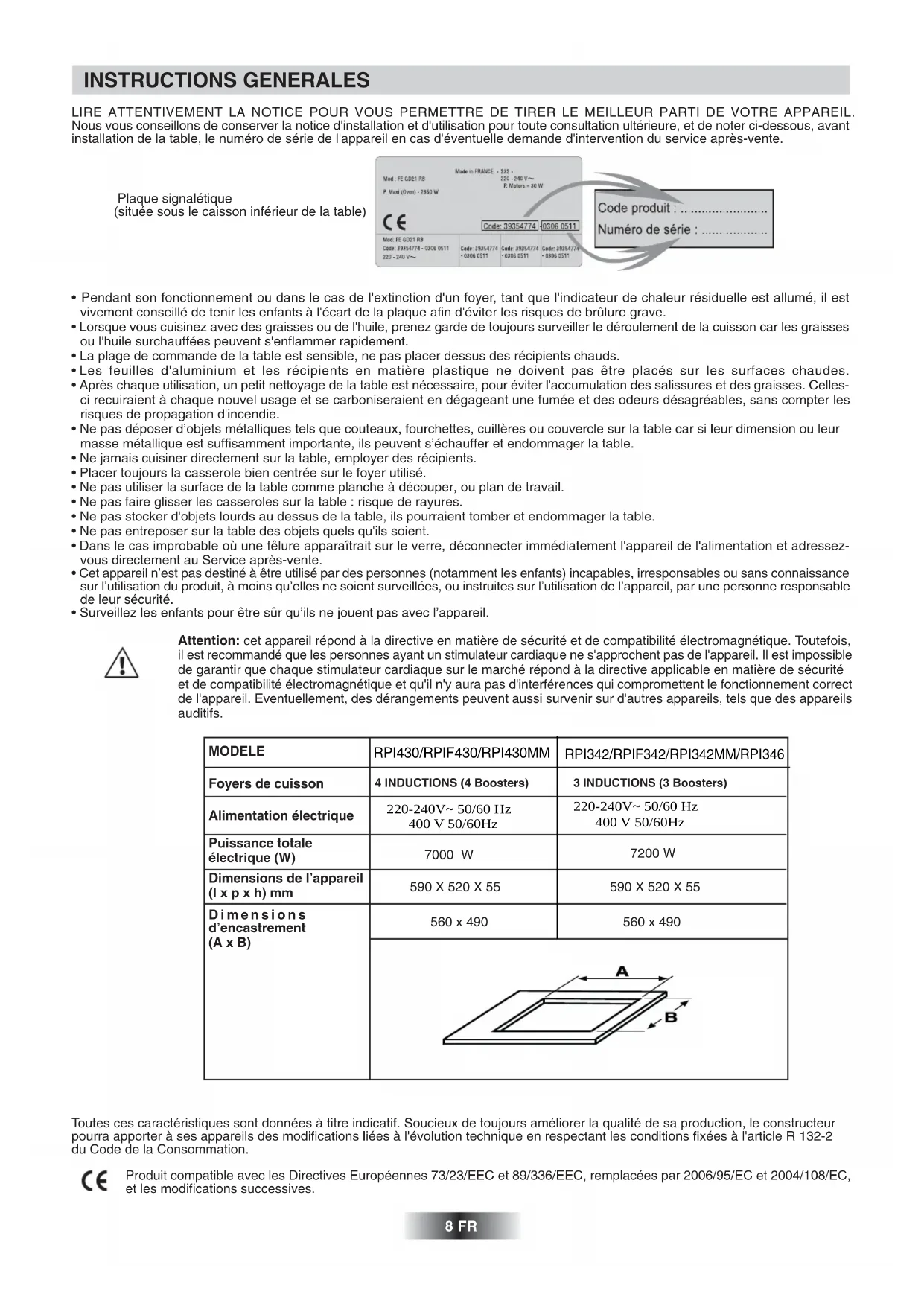 - Surveillez les enfants pour être sûr qu’ils ne jouent pas avec l’appareil. Attention: cet appareil répond à la directive en matière de sécurité et de compatibilité électromagnétique. Toutefois, il est recommandé que les personnes ayant un stimulateur cardiaque ne s'approchent pas de l'appareil. Il est impossible de garantir que chaque stimulateur cardiaque sur le marché répond à la directive applicable en matière de sécurité et de compatibilité électromagnétique et qu'il n'y aura pas d'interférences qui compromettent le fonctionnement correct de l'appareil. Eventuellement, des dérangements peuvent aussi survenir sur d'autres appareils, tels que des appareils auditifs. Toutes ces caractéristiques sont données à titre indicatif. Soucieux de toujours améliorer la qualité de sa production, le constructeur pourra apporter à ses appareils des modifications liées à l'évolution technique en respectant les conditions fixées à l'article R 132-2 du Code de la Consommation. Produit compatible avec les Directives Européennes 73/23/EEC et 89/336/EEC, remplacées par 2006/95/EC et 2004/108/EC, et les modifications successives. MODELE Foyers de cuisson Alimentation électrique Puissance totale électrique (W) Dimensions de l’appareil (l x p x h) mm Dimensions d’encastrement (A x B) 3 INDUCTIONS (3 Boosters) 7000 W 590 X 520 X 55 560 x 490 4 INDUCTIONS (4 Boosters) 7200 W 590 X 520 X 55 560 x 490 8 FR