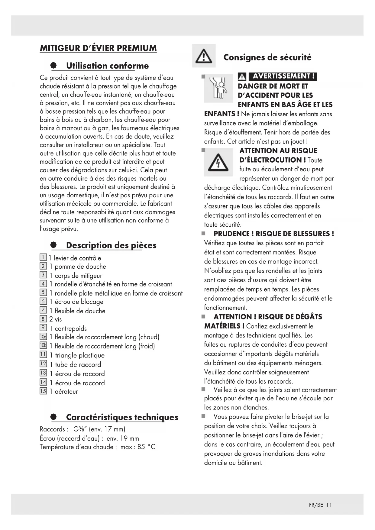 1 aérateur § Caractéristiques techniques Raccords : G3⁄8” (env. 17 mm) Écrou (raccord d’eau) : env. 19 mm Température d’eau chaude : max.: 85 °C Consignes de sécurité