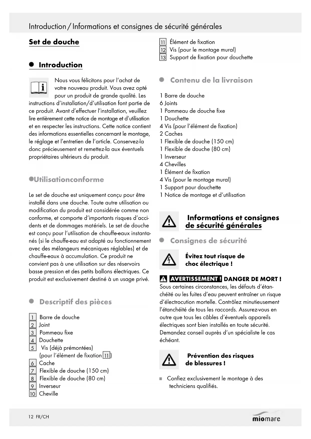 Support de fixation pour douchette Contenu de la livraison 1 Barre de douche 6 Joints 1 Pommeau de douche fixe 1 Douchette 4 Vis (pour l‘élément de fixation) 2 Caches 1 Flexible de douche (150 cm) 1 Flexible de douche (80 cm) 1 Inverseur 4 Chevilles 1 Élément de fixation 4 Vis (pour le montage mural) 1 Support pour douchette 1 Notice de montage et d‘utilisation Informations et consignes de sécurité générales Consignes de sécurité Évitez tout risque de choc électrique ! DANGER DE MORT ! Sous certaines circonstances, les défauts d‘étan- chéité ou les fuites d‘eau peuvent entraîner un risque d‘électrocution mortelle. Contrôlez minutieusement l’étanchéité de tous les raccords. Assurez-vous en outre que tous les câbles d‘éventuels appareils électriques sont bien installés en toute sécurité. Demandez conseil auprès d‘un spécialiste le cas échéant. Prévention des risques de blessures ! Confiez exclusivement le montage à des techniciens qualifiés.13 FR/CH Introduction / Informations et consignes de sécurité générales Informations et consignes de sécurité générales / Montage et utilisation Éloignez les sachets et films d‘emballage de la portée des bé bés et des jeunes enfants. Il existe un risque d‘asphyxie ! ATTENTION ! RISQUE DE BLESSURES ! Vérifiez que toutes les pièces sont en parfait état et correctement montées. Il existe un risque de blessures en cas de montage incorrect. Les pièces endommagées peuvent affecter la sécurité de l‘utilisateur et le fonctionnement de l‘article. N’utilisez pas la barre de douche