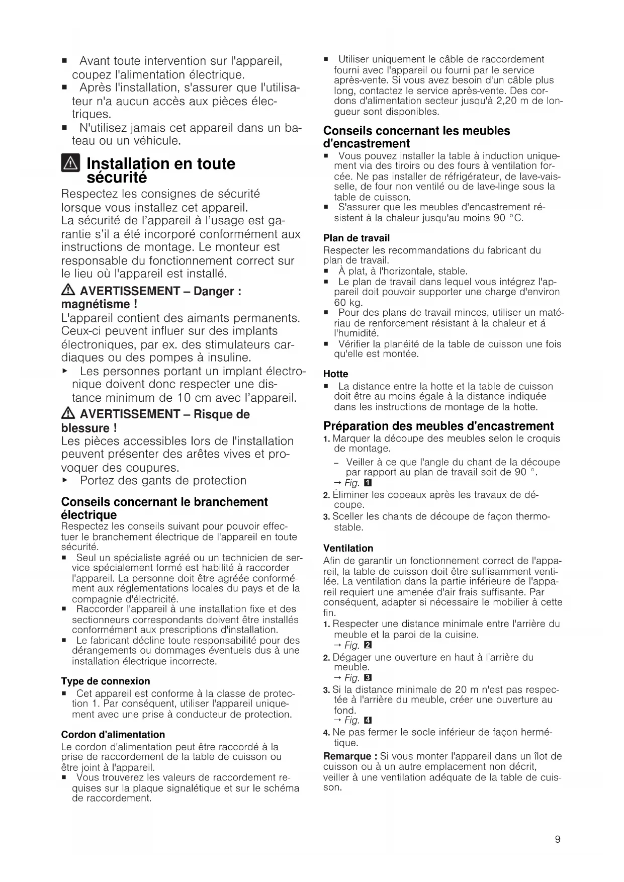 Indications générales ¡ Lisez attentivement cette notice. ¡ Seul un spécialiste agréé est autorisé à brancher l'appareil. ¡ Une installation, une ouverture de l'appa- reil, un raccordement ou un montage in- corrects annulent la validité de la garantie du produit.9 ¡ Avant toute intervention sur l'appareil, coupez l'alimentation électrique. ¡ Après l'installation, s'assurer que l'utilisa- teur n'a aucun accès aux pièces élec- triques. ¡ N'utilisez jamais cet appareil dans un ba- teau ou un véhicule. Installation en toute sécurité Respectez les consignes de sécurité lorsque vous installez cet appareil. La sécurité de l’appareil à l’usage est ga- rantie s’il a été incorporé conformément aux instructions de montage. Le monteur est responsable du fonctionnement correct sur le lieu où l'appareil est installé. AVERTISSEMENT‒Danger: magnétisme! L'appareil contient des aimants permanents. Ceux-ci peuvent influer sur des implants électroniques, par ex. des stimulateurs car- diaques ou des pompes à insuline. ▶ Les personnes portant un implant électro- nique doivent donc respecter une dis- tance minimum de 10cm avec l’appareil. AVERTISSEMENT‒Risque de blessure! Les pièces accessibles lors de l'installation peuvent présenter des arêtes vives et pro- voquer des coupures. ▶ Portez des gants de protection Conseils concernant le branchement électrique Respectez les conseils suivant pour pouvoir effec- tuer le branchement électrique de l'appareil en toute sécurité. ¡ Seul un spécialiste agréé ou un technicien de ser- vice spécialement formé est habilité à raccorder l'appareil. La personne doit être agréée conformé- ment aux réglementations locales du pays et de la compagnie d'électricité. ¡ Raccorder l'appareil à une installation fixe et des sectionneurs correspondants doivent être installés conformément aux prescriptions d'installation. ¡ Le fabricant décline toute responsabilité pour des dérangements ou dommages éventuels dus à une installation électrique incorrecte. Type de connexion ¡ Cet appareil est conforme à la classe de protec- tion 1. Par conséquent, utiliser l'appareil unique- ment avec une prise à conducteur de protection. Cordon d'alimentation Le cordon d'alimentation peut être raccordé à la prise de raccordement de la table de cuisson ou être joint à l'appareil. ¡ Vous trouverez les valeurs de raccordement re- quises sur la plaque signalétique et sur le schéma de raccordement. ¡ Utiliser uniquement le câble de raccordement fourni avec l'appareil ou fourni par le service après-vente. Si vous avez besoin d'un câble plus long, contactez le service après-vente. Des cor- dons d'alimentation secteur jusqu'à 2,20 m de lon- gueur sont disponibles. Conseils concernant les meubles d'encastrement ¡ Vous pouvez installer la table à induction unique- ment via des tiroirs ou des fours à ventilation for- cée. Ne pas installer de réfrigérateur, de lave-vais- selle, de four non ventilé ou de lave-linge sous la table de cuisson. ¡ S'assurer que les meubles d'encastrement ré- sistent à la chaleur jusqu'au moins 90°C. Plan de travail Respecter les recommandations du fabricant du plan de travail. ¡ À plat, à l'horizontale, stable. ¡ Le plan de travail dans lequel vous intégrez l'ap- pareil doit pouvoir supporter une charge d'environ 60kg. ¡ Pour des plans de travail minces, utiliser un maté- riau de renforcement résistant à la chaleur et á l'humidité. ¡ Vérifier la planéité de la table de cuisson une fois qu'elle est montée. Hotte ¡ La distance entre la hotte et la table de cuisson doit être au moins égale à la distance indiquée dans les instructions de montage de la hotte. Préparation des meubles d'encastrement
