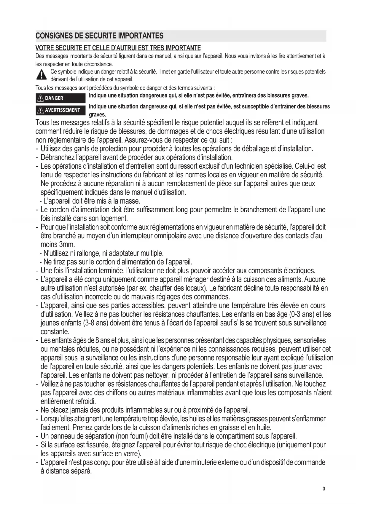 VOTRE SECURITE ET CELLE D’AUTRUI EST TRES IMPORTANTE Des messages importants de sécurité gurent dans ce manuel, ainsi que sur l’appareil. Nous vous invitons à les lire attentivement et à les respecter en toute circonstance. Ce symbole indique un danger relatif à la sécurité. Il met en garde l’utilisateur et toute autre personne contre les risques potentiels dérivant de l’utilisation de cet appareil. Tous les messages sont précédées du symbole de danger et des termes suivants : Indique une situation dangereuse qui, si elle n’est pas évitée, entraînera des blessures graves. Indique une situation dangereuse qui, si elle n’est pas évitée, est susceptible d’entraîner des blessures graves. Tous les messages relatifs à la sécurité spécient le risque potentiel auquel ils se réfèrent et indiquent comment réduire le risque de blessures, de dommages et de chocs électriques résultant d’une utilisation non réglementaire de l’appareil. Assurez-vous de respecter ce qui suit : - Utilisez des gants de protection pour procéder à toutes les opérations de déballage et d’installation. - Débranchez l’appareil avant de procéder aux opérations d’installation. - Les opérations d’installation et d’entretien sont du ressort exclusif d’un technicien spécialisé. Celui-ci est tenu de respecter les instructions du fabricant et les normes locales en vigueur en matière de sécurité. Ne procédez à aucune réparation ni à aucun remplacement de pièce sur l’appareil autres que ceux spéciquement indiqués dans le manuel d’utilisation. - L’appareil doit être mis à la masse. - Le cordon d’alimentation doit être sufsamment long pour permettre le branchement de l’appareil une fois installé dans son logement. - Pour que l’installation soit conforme aux réglementations en vigueur en matière de sécurité, l’appareil doit être branché au moyen d’un interrupteur omnipolaire avec une distance d’ouverture des contacts d’au moins 3mm. - N’utilisez ni rallonge, ni adaptateur multiple. - Ne tirez pas sur le cordon d’alimentation de l’appareil. - Une fois l’installation terminée, l’utilisateur ne doit plus pouvoir accéder aux composants électriques. - L’appareil a été conçu uniquement comme appareil ménager destiné à la cuisson des aliments. Aucune autre utilisation n’est autorisée (par ex. chauffer des locaux). Le fabricant décline toute responsabilité en cas d’utilisation incorrecte ou de mauvais réglages des commandes. - L’appareil, ainsi que ses parties accessibles, peuvent atteindre une température très élevée en cours d’utilisation. Veillez à ne pas toucher les résistances chauffantes. Les enfants en bas âge (0-3 ans) et les jeunes enfants (3-8 ans) doivent être tenus à l’écart de l’appareil sauf s’ils se trouvent sous surveillance constante. - Les enfants âgés de 8 ans et plus, ainsi que les personnes présentant des capacités physiques, sensorielles ou mentales réduites, ou ne possédant ni l’expérience ni les connaissances requises, peuvent utiliser cet appareil sous la surveillance ou les instructions d’une personne responsable leur ayant expliqué l’utilisation de l’appareil en toute sécurité, ainsi que les dangers potentiels. Les enfants ne doivent pas jouer avec l’appareil. Les enfants ne doivent pas nettoyer, ni procéder à l’entretien de l’appareil sans surveillance. - Veillez à ne pas toucher les résistances chauffantes de l’appareil pendant et après l’utilisation. Ne touchez pas l’appareil avec des chiffons ou autres matériaux inammables avant que tous les composants n’aient entièrement refroidi. - Ne placez jamais des produits inammables sur ou à proximité de l’appareil. - Lorsqu’elles atteignent une température trop élevée, les huiles et les matières grasses peuvent s’enammer facilement. Prenez garde lors de la cuisson d’aliments riches en graisse et en huile. - Un panneau de séparation (non fourni) doit être installé dans le compartiment sous l’appareil. - Si la surface est ssurée, éteignez l’appareil pour éviter tout risque de choc électrique (uniquement pour les appareils avec surface en verre). - L’appareil n’est pas conçu pour être utilisé à l’aide d’une minuterie externe ou d’un dispositif de commande à distance séparé. DANGER AVERTISSEMENT4 - La cuisson sans surveillance d’un plat contenant de la graisse ou de l’huile sur une plaque chauffante peut s’avérer dangereuse et provoquer un incendie. N’essayez JAMAIS d’éteindre un feu avec de l’eau, mais éteignez l’appareil puis couvrez les ammes à l’aide d’un couvercle par ex. ou d’une couverture anti feu. Risque d’incendie : ne stockez pas d’objets sur les surfaces de cuisson. - N’utilisez pas d’appareils de nettoyage à la vapeur. - Les objets métalliques tels que les couteaux, fourchettes, cuillères et couvercles ne doivent pas être placés sur la surface de la table de cuisson car ils peuvent devenir très chauds. - Après l’utilisation, éteignez la table de cuisson à l’aide de sa commande et ne vous ez pas au détecteur de casserole (uniquement pour les appareils à induction). CONSEILS POUR LA PROTECTION DE L’ENVIRONNEMENT Elimination des emballages Les matériaux d’emballage sont entièrement recyclables et portent le symbole de recyclage ( ).Les diverses pièces de l’emballage ne doivent pas être jetées dans la nature, mais elles doivent être mises au rebut conformément aux réglementations locales en vigueur. Mise au rebut Cet appareil est certié conforme à la Directive européenne 2002/96/CE relative aux déchets d’équipements électriques et électroniques (DEEE). En procédant correctement à la mise au rebut de cet appareil, l’utilisateur peut contribuer à empêcher toute conséquence nuisible à l’environnement et à la santé. Le symbole gurant sur l’appareil ou dans l
