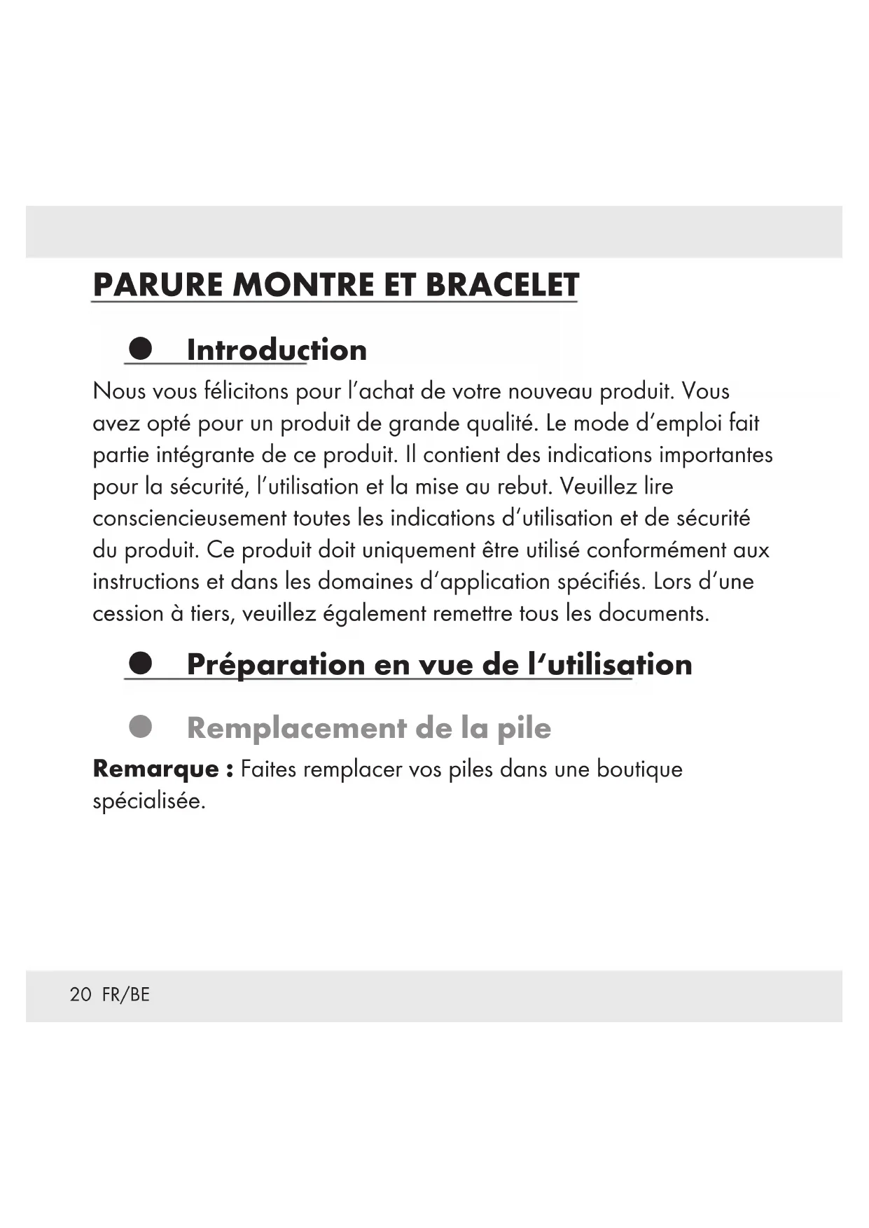 Introduction Nous vous félicitons pour l’achat de votre nouveau produit. Vous avez opté pour un produit de grande qualité. Le mode d‘emploi fait partie intégrante de ce produit. Il contient des indications importantes pour la sécurité, l’utilisation et la mise au rebut. Veuillez lire consciencieusement toutes les indications d‘utilisation et de sécurité du produit. Ce produit doit uniquement être utilisé conformément aux instructions et dans les domaines d‘application spécifiés. Lors d‘une cession à tiers, veuillez également remettre tous les documents. Préparation en vue de l‘utilisation Remplacement de la pile Remarque : Faites remplacer vos piles dans une boutique spécialisée.21 FR/BE Affichage