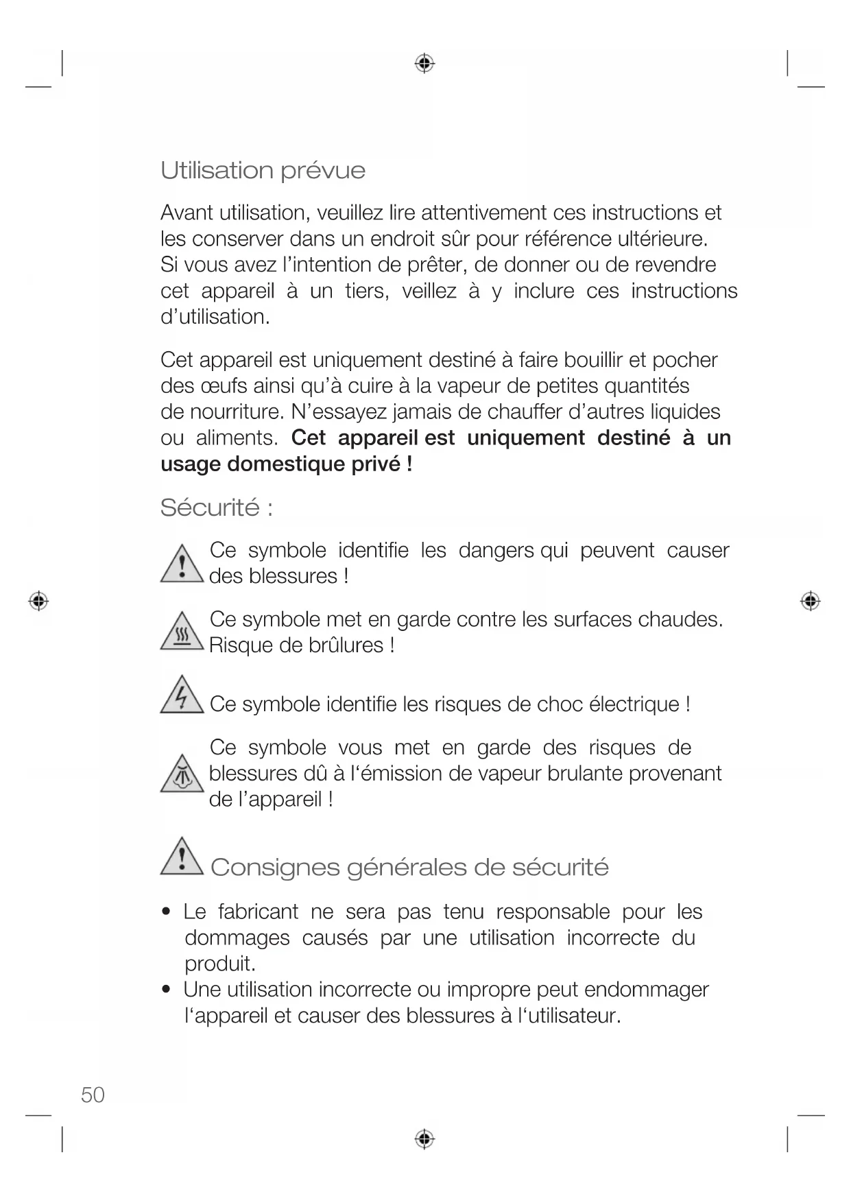 - Votre cuiseur à œuf est uniquement destiné à faire bouillir des œufs ou à cuire de petites quantités de nourriture (par exemple, des légumes, du poisson, de la viande). N’essayez jamais de chauffer d’autres liquides ou aliments.FRANçAIS Manuel d‘instructions