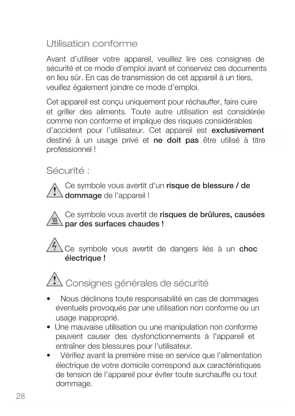 - fordamagescausedbyowner This guarantee does not affect your statutory right, nor any legal right you may have as a costumer under applicable national legislation governing the purchase of goods. Inordertoasserthis/herrightinaguaranteecaseduringthe guaranteed period, the customer must provide evidence of the dateofpurchase(receipt). The guarantee is to be asserted against KORONA electric GmbH, Sundern/Germany. Service Address: KORONA Service Am Steinbach 8 59872 Meschede-Enste Germany Telephone Hotline: 02933 90284-80 Mail: service@korona-electric.de web: www.korona-electric.de within 2 years after the date of purchase. In case of guarantee the customer is given the right to get the appliance repaired at our own or at an authorized shop. Further rights (due to guaranteecase)arenotgiventothecustomer.28 Utilisation conforme Avant d’utiliser votre appareil, veuillez lire ces consignes de sécurité et ce mode d'emploi avant et conservez ces documents en lieu sûr. En cas de transmission de cet appareil à un tiers, veuillez également joindre ce mode d’emploi. Cetappareilestconçuuniquementpourréchauffer,fairecuire et griller des aliments. Toute autre utilisation est considérée commenonconformeetimpliquedesrisquesconsidérables d’accident pour l’utilisateur. Cet appareil est exclusivement destiné à un usage privé et ne doit pas être utilisé à titre professionnel! Sécurité : Ce symbole vous avertit d'un risque de blessure / de dommage de l'appareil! Ce symbole vous avertit de risques de brûlures, causées par des surfaces chaudes! Ce symbole vous avertit de dangers liés à un choc électrique! Consignes générales de sécurité