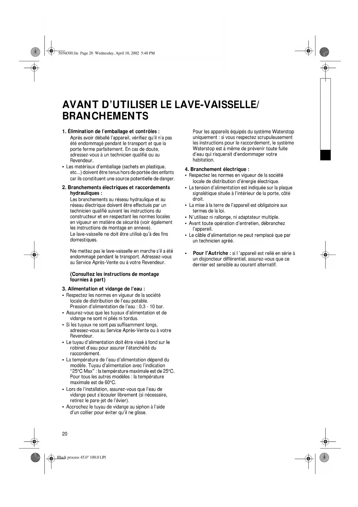 - Pour l’Autriche : si l ’appareil est relié en série à un disjoncteur différentiel, assurez-vous que ce dernier est sensible au courant alternatif. 5fr94300.fm Page 20 Wednesday, April 10, 2002 5:48 PM Black process 45.0° 100.0 LPI21