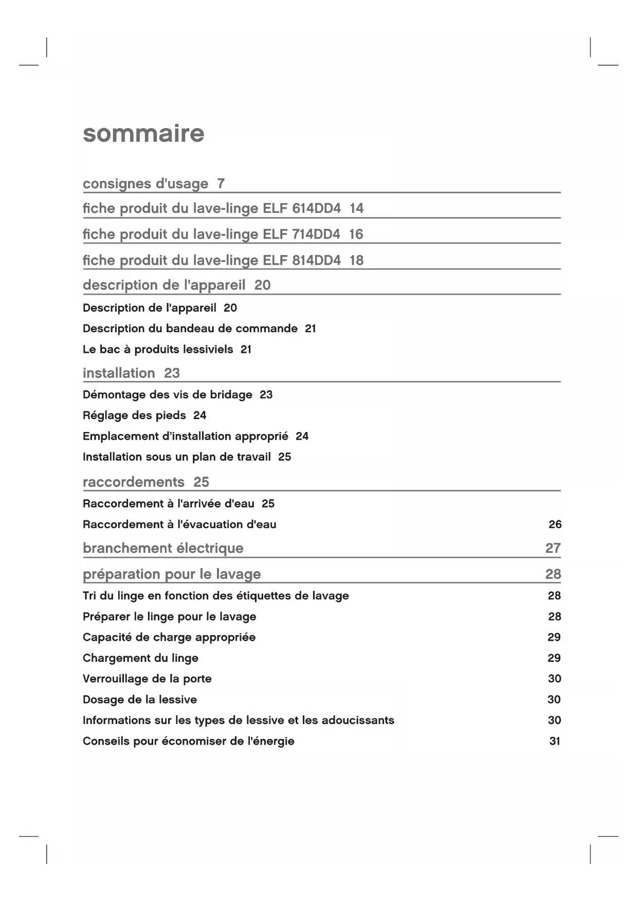 ELF 814DD4 Notice d’utilisation Pour vous aider à bien vivre votre achatVous venez d’acquérir un produit de la marque Essentiel b et nous vous en remercions. Nous apportons un soin tout particulier à la FIABILITÉ, à la FACILITÉ D'USAGE et au DESIGN de nos produits. Nous espérons que ce lave-linge vous donnera entière satisfaction.sommaire consignes d'usage 7 fiche produit du lave-linge ELF 614DD4 14 fiche produit du lave-linge ELF 714DD4 16 fiche produit du lave-linge ELF 814DD4 18 description de l'appareil 20 Description de l'appareil 20 Description du bandeau de commande 21 Le bac à produits lessiviels 21 installation 23 Démontage des vis de bridage 23 Réglage des pieds 24 Emplacement d’installation approprié 24 Installation sous un plan de travail 25 raccordements 25 Raccordement à l'arrivée d'eau 25 Raccordement à l'évacuation d'eau 26 branchement électrique 27 préparation pour le lavage 28 Tri du linge en fonction des étiquettes de lavage 28 Préparer le linge pour le lavage 28 Capacité de charge appropriée 29 Chargement du linge 29 Verrouillage de la porte 30 Dosage de la lessive 30 Informations sur les types de lessive et les adoucissants 30 Conseils pour économiser de l'énergie 31utilisation 32