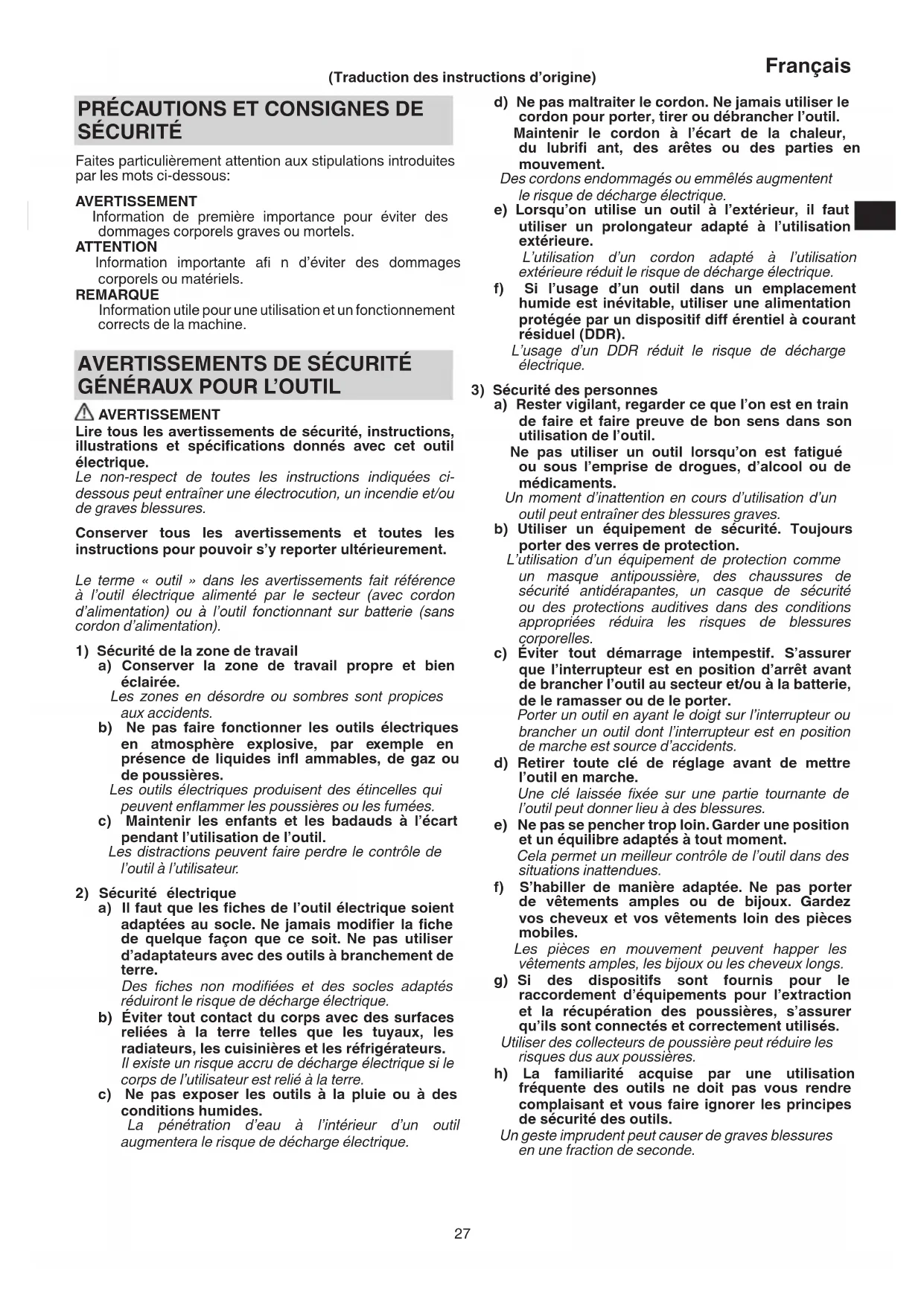 AVERTISSEMENT Lire tous les avertissements de sécurité, instructions, illustrations et spécifi cations donnés avec cet outil électrique. Le non-respect de toutes les instructions indiquées ci- dessous peut entraîner une électrocution, un incendie et/ou de graves blessures. Conserver tous les avertissements et toutes les instructions pour pouvoir s’y reporter ultérieurement. Le terme « outil » dans les avertissements fait référence à l’outil électrique alimenté par le secteur (avec cordon d’alimentation) ou à l’outil fonctionnant sur batterie (sans cordon d’alimentation).