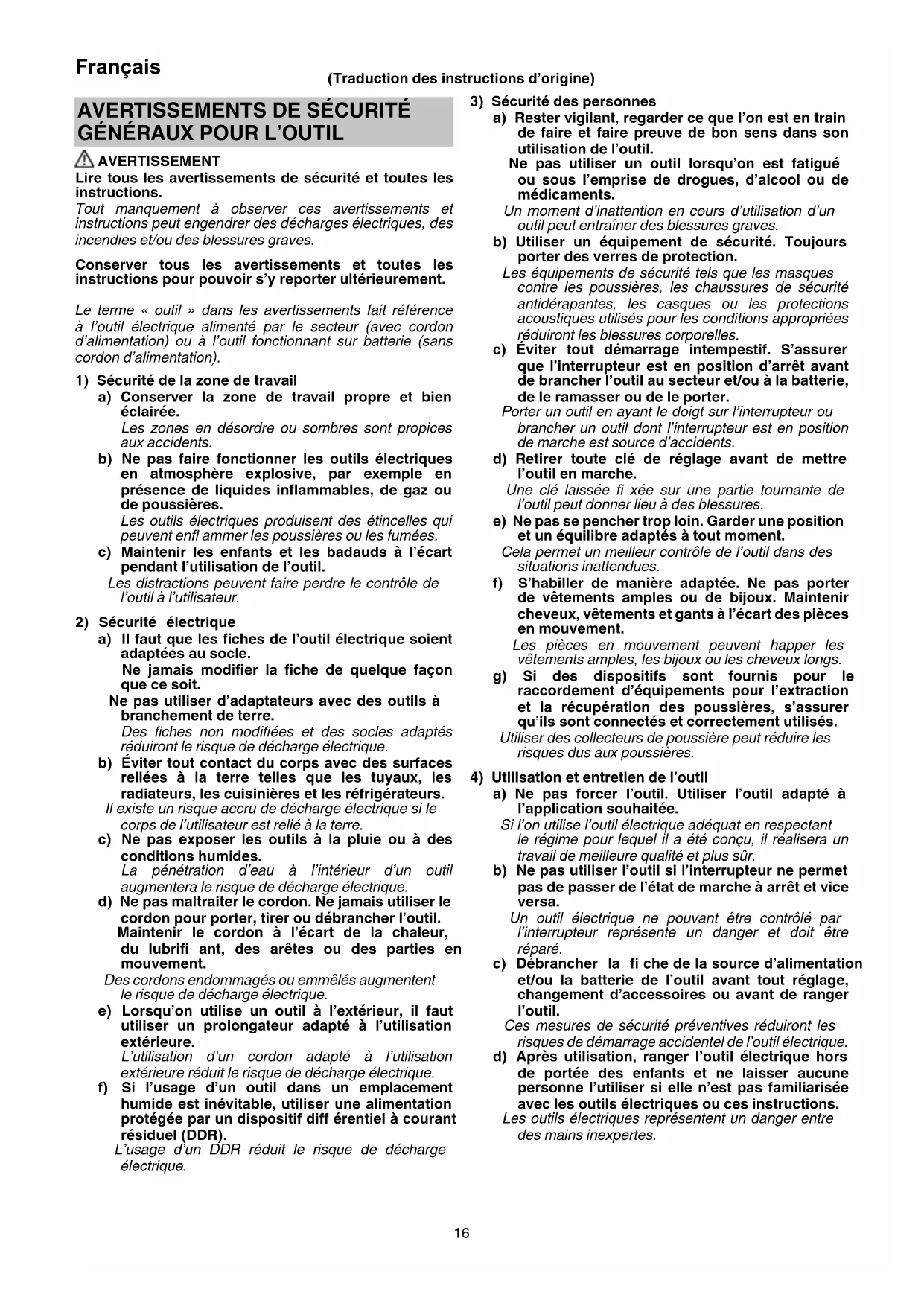 AVERTISSEMENT Lire tous les avertissements de sécurité et toutes les instructions. Tout manquement à observer ces avertissements et instructions peut engendrer des décharges électriques, des incendies et/ou des blessures graves. Conserver tous les avertissements et toutes les instructions pour pouvoir s’y reporter ultérieurement. Le terme « outil » dans les avertissements fait référence à l’outil électrique alimenté par le secteur (avec cordon d’alimentation) ou à l’outil fonctionnant sur batterie (sans cordon d’alimentation).