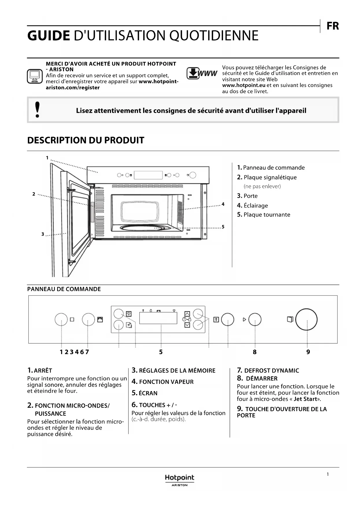 MERCI D'AVOIR ACHETÉ UN PRODUIT HOTPOINT ARISTONAfin de recevoir un service et un support complet, merci d'enregistrer votre appareil sur www.hotpoint-ariston.com/registerVous pouvez télécharger les Consignes de sécurité et le Guide d'utilisation et entretien en visitant notre site Web www.hotpoint.eu et en suivant les consignes au dos de ce livret. WWW2 PANIERVAPEUR Pour cuire à la vapeur les aliments comme le poisson ou les légumes, placez-les dans le panier (2) et versez de l’eau potable (100 ml) dans la partie inférieure du panier- vapeur (3) pour obtenir la bonne quantité de vapeur. Pour cuire des aliments comme les pâtes, le riz, ou les pommes de terre, placez-les directement dans la partie inférieure du panier-vapeur (vous n’avez pas besoin du panier) et ajoutez la quantité d’eau potable adéquate pour la quantité d’aliments à cuire. Pour les meilleurs résultats, couvrez le panier- vapeur avec le couvercle (1) fourni. Placez toujours le panier-vapeur sur la plaque tournante en verre et utilisez-le uniquement avec les fonctions de cuisson compatibles ou avec les fonctions du four à micro-ondes. FONCTIONS PLAQUE TOURNANTE Installée sur son support, la plaque tournante en verre peut être utilisée avec toutes les méthodes de cuisson. La plaque tournante peut toujours être utilisée comme base pour les autres récipients ou accessoires.