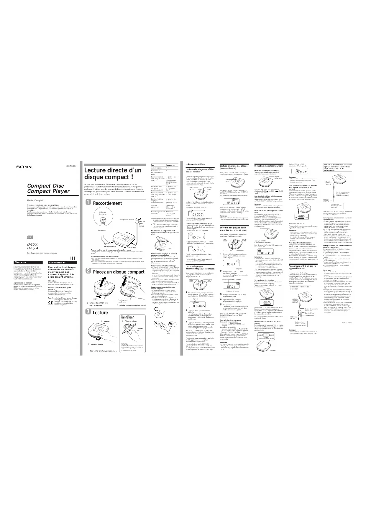 2 Réglez le volume. 1 Appuyez sur ^ .Pour arrêter la lecture, appuyez sur p .Pour utiliser latélécommande 1 Appuyez sur ^ . 2 Réglez le volume. Mode d’emploi A propos du code de zone géographiqueLe code de zone géographique du lecteur dont vous venez de faire l’acquisitionest indiqué dans l’angle supérieur gauche de l’étiquette à code à barres del’emballage.Pour les accessoires fournis avec votre lecteur, relevez le code de zonegéographique de votre modèle et consultez les “Accessoires fournis” à la fin duprésent mode d’emploi.3-860-728-32 (1) D-E500 D-E504 RemarqueLa forme de la télécommande fournieavec les modèles CED, CEK et E92 estdifférente de celle-ci. Pour commencerla lecture, appuyez sur ( . AVERTISSEMENT Pour éviter tout danger d’incendie ou de choc électrique, ne pas exposer l’appareil à la pluie ou à l’humidité. AttentionL’emploi d’instruments optiques avec cetappareil augmente les dangers pour les yeux.Pour les clients ailleurs qu’enPologneLa marque apposée sur l’appareil estuniquement applicable aux produitscommercialisés en Pologne.Pour les clients ailleurs qu’en EuropeLa marque CE indiquée surl’appareil n’est valable que pour lesproduits commercialisés dansl’Union européenne. Bienvenue ! Nous vous remercions d’avoir faitl’acquisition d’un lecteur de disquescompacts Sony. Avant de fairefonctionner votre lecteur, veuillez lireattentivement le présent moded’emploi, que vous conserverez pourtoute référence ultérieure.A propos de ce manuelLes instructions contenues dans le présentmanuel concernent les appareils D-E500 et D-E504. Avant de commencer votre lecture,vérifiez votre numéro de modèle.Pour les modèles fournis avec un adaptateur de fiche secteurSi l’adaptateur secteur ne s’adapte pas dans la prise murale, utilisez l’adaptateur de fichesecteur.Modèles fournis avec une télécommande• Branchez la microfiche des écouteurs sur la télécommande, pas sur la prise PHONES/REMOTE du lecteur.• Branchez correctement la fiche des écouteurs sur la télécommande. Une connexion lâcherisque de provoquer des parasites durant la lecture. Placez un disque compact Lecture directe d’un disque compact ! Si vous souhaitez écouter directement un disque compact, il est préférable de faire fonctionner votre lecteur sur secteur. Vous pouvez également l’utiliser avec les sources d’alimentation suivantes : batterie rechargeable, piles sèches (voir aussi la section “Sources d’alimentation” au verso) et batterie de voiture. Raccordement 1 Faites coulisser OPEN pour ouvrir le couvercle. OPEN