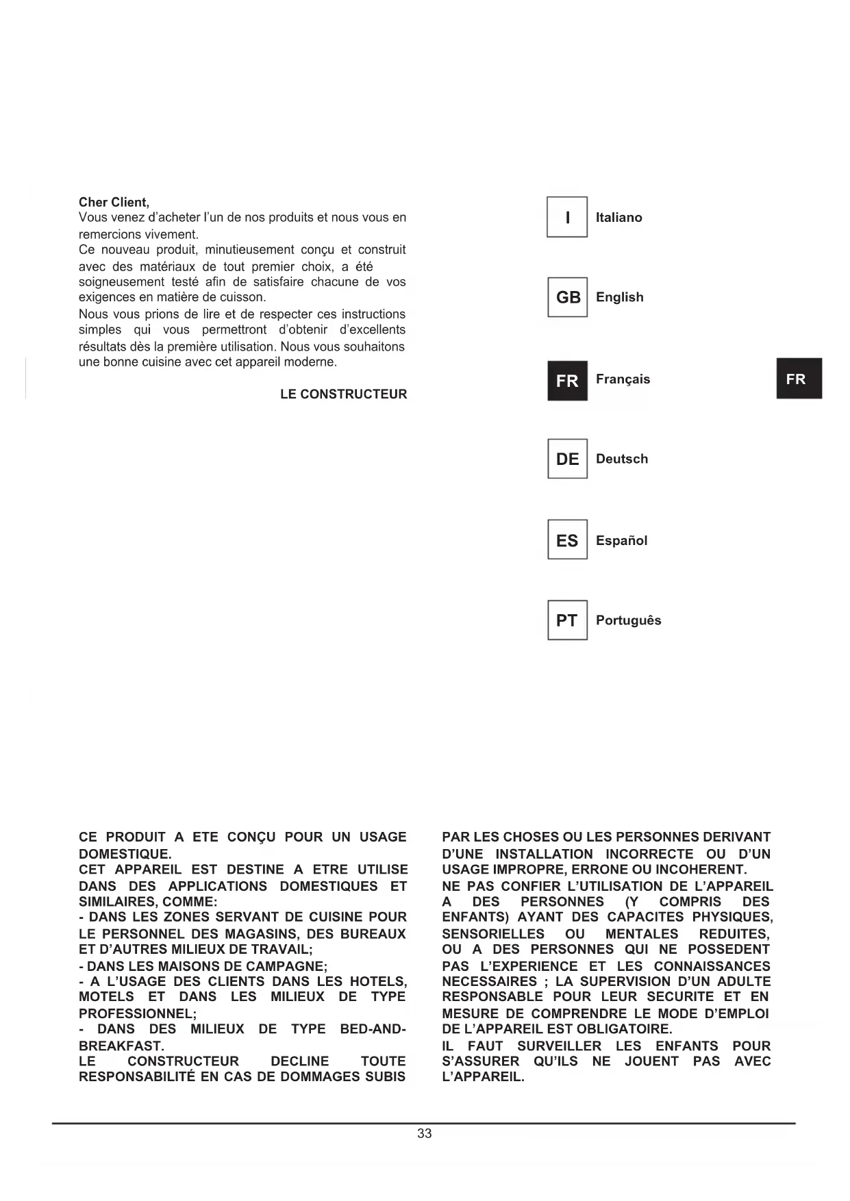 S’ASSURER QU’ILS NE JOUENT PAS AVEC L’APPAREIL. Cher Client, Vous venez d’acheter l’un de nos produits et nous vous en remercions vivement. Ce nouveau produit, minutieusement conçu et construit avec des matériaux de tout premier choix, a été soigneusement testé an de satisfaire chacune de vos exigences en matière de cuisson. Nous vous prions de lire et de respecter ces instructions simples qui vous permettront d’obtenir d’excellents résultats dès la première utilisation. Nous vous souhaitons une bonne cuisine avec cet appareil moderne. LE CONSTRUCTEUR Italiano