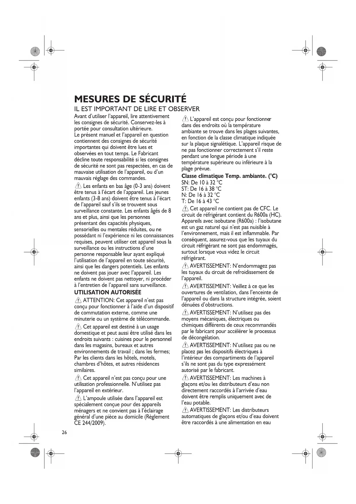 dans des endroits où la température ambiante se trouve dans les plages suivantes, en fonction de la classe climatique indiquée sur la plaque signalétique. L’appareil risque de ne pas fonctionner correctement s’il reste pendant une longue période à une température supérieure ou inférieure à la plage prévue. Classe climatique Temp. ambiante. (°C) SN: De 10 à 32 °C ST: De 16 à 38 °C N: De 16 à 32 °C T: De 16 à 43 °C Cet appareil ne contient pas de CFC. Le circuit de réfrigérant contient du R600a (HC). Appareils avec isobutane (R600a) : l’isobutane est un gaz naturel qui n’est pas nuisible à l’environnement, mais il est inflammable. Par conséquent, assurez-vous que les tuyaux du circuit réfrigérant ne sont pas endommagés, surtout lorsque vous videz le circuit réfrigérant.