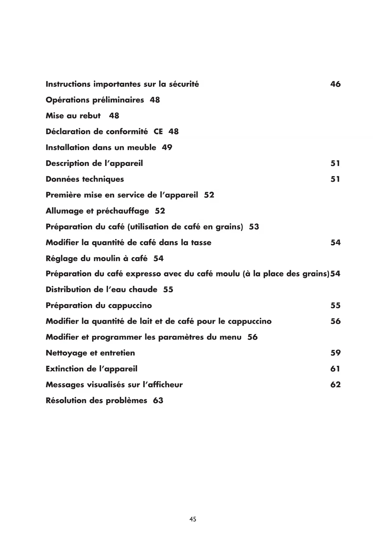 Distribution de l’eau chaude 55 Préparation du cappuccino 55 Modifier la quantité de lait et de café pour le cappuccino 56 Modifier et programmer les paramètres du menu 56 Nettoyage et entretien 59 Extinction de l’appareil 61 Messages visualisés sur l’afficheur 62 Résolution des problèmes 63 45Instructions importantes sur la sécurité