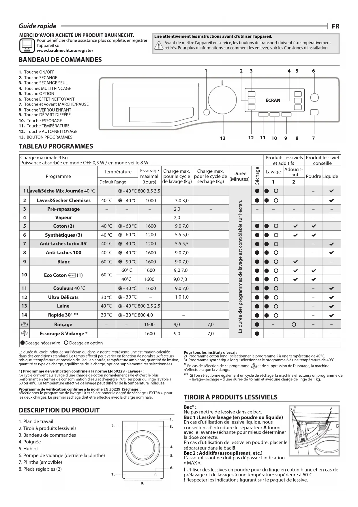 MERCI D’AVOIR ACHETÉ UN PRODUIT BAUKNECHT. Pour bénécier d’une assistance plus complète, enregistrer l’appareil sur www.bauknecht.eu/register Lire attentivement les instructions avant d’utiliser l’appareil