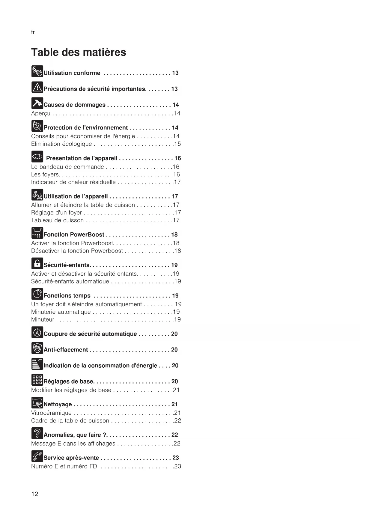 - Présentation de l'appareil . . . . . . . . . . . . . . . . . 16 Le bandeau de commande . . . . . . . . . . . . . . . . . . . .16 Les foyers. . . . . . . . . . . . . . . . . . . . . . . . . . . . . . . . . .16 Indicateur de chaleur résiduelle . . . . . . . . . . . . . . . . .17 1 Utilisation de l’appareil . . . . . . . . . . . . . . . . . . . 17 Allumer et éteindre la table de cuisson . . . . . . . . . . .17 Réglage d'un foyer . . . . . . . . . . . . . . . . . . . . . . . . . . .17 Tableau de cuisson . . . . . . . . . . . . . . . . . . . . . . . . . .17 v Fonction PowerBoost . . . . . . . . . . . . . . . . . . . . 18 Activer la fonction Powerboost. . . . . . . . . . . . . . . . . .18 Désactiver la fonction Powerboost . . . . . . . . . . . . . . .18 A Sécurité-enfants. . . . . . . . . . . . . . . . . . . . . . . . . 19 Activer et désactiver la sécurité enfants. . . . . . . . . . .19 Sécuritéenfants automatique . . . . . . . . . . . . . . . . . . .19 O Fonctions temps . . . . . . . . . . . . . . . . . . . . . . . . 19 Un foyer doit s'éteindre automatiquement . . . . . . . . . 19 Minuterie automatique . . . . . . . . . . . . . . . . . . . . . . . .19 Minuteur . . . . . . . . . . . . . . . . . . . . . . . . . . . . . . . . . . .19 b Coupure de sécurité automatique . . . . . . . . . . 20 k Anti-effacement . . . . . . . . . . . . . . . . . . . . . . . . . 20 [ Indication de la consommation d'énergie . . . . 20 Q Réglages de base. . . . . . . . . . . . . . . . . . . . . . . . 20 Modifier les réglages de base . . . . . . . . . . . . . . . . . .21 D Nettoyage . . . . . . . . . . . . . . . . . . . . . . . . . . . . . . 21 Vitrocéramique . . . . . . . . . . . . . . . . . . . . . . . . . . . . . .21 Cadre de la table de cuisson . . . . . . . . . . . . . . . . . . .22 3 Anomalies, que faire ?. . . . . . . . . . . . . . . . . . . . 22 Message E dans les affichages . . . . . . . . . . . . . . . . .22 4 Service après-vente . . . . . . . . . . . . . . . . . . . . . . 23 Numéro E et numéro FD . . . . . . . . . . . . . . . . . . . . . .23Utilisation conforme fr