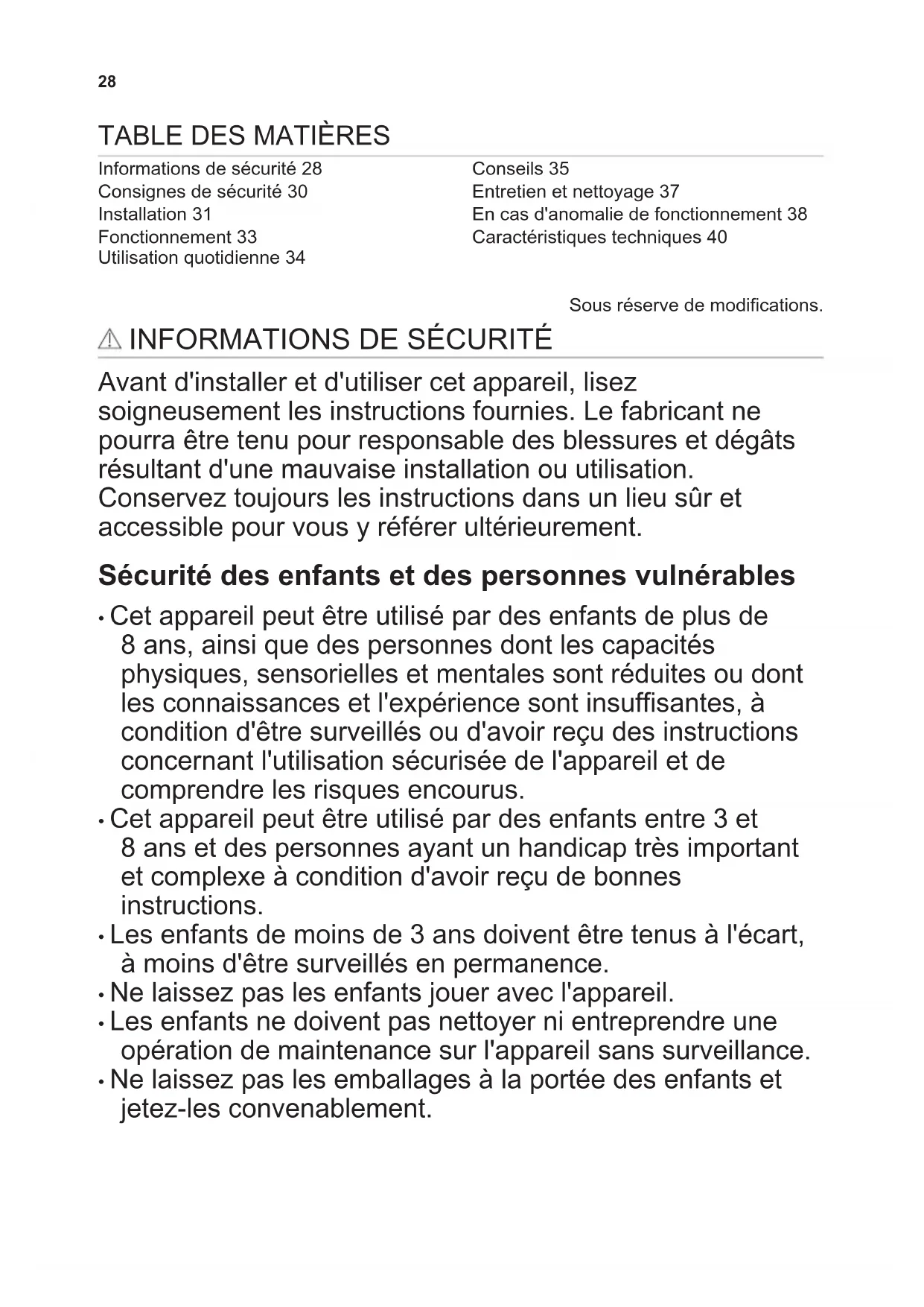 Informations de sécurité 28 Consignes de sécurité 30 Installation 31 Fonctionnement 33 Utilisation quotidienne 34 Conseils 35 Entretien et nettoyage 37 En cas d'anomalie de fonctionnement 38 Caractéristiques techniques 40 Sous réserve de modifications.