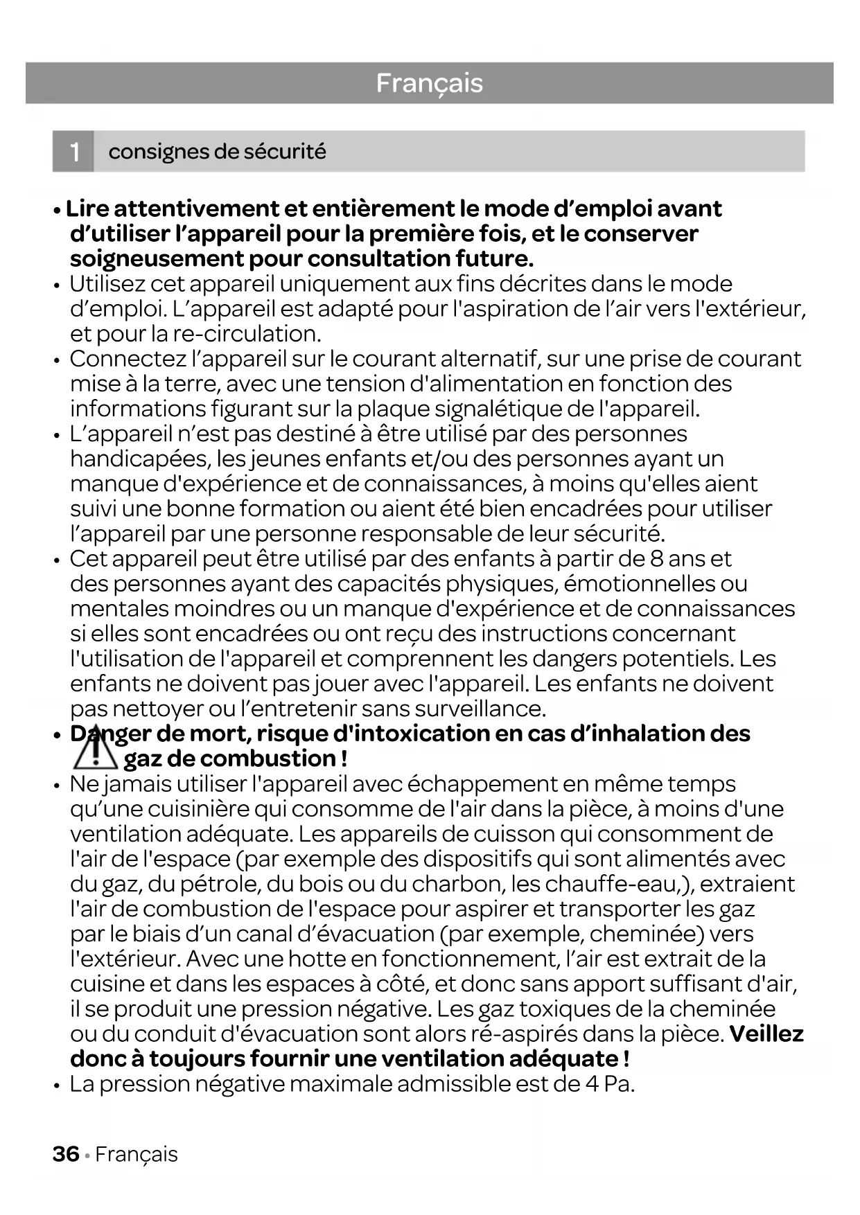 - La pression négative maximale admissible est de 4 Pa. Français consignes de sécurité