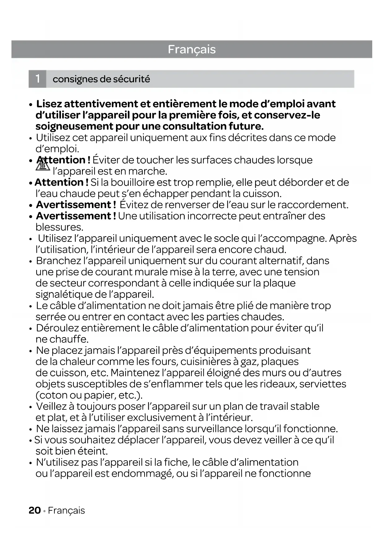 - Attention! Si la bouilloire est trop remplie, elle peut déborder etde l’eau chaude peut s’en échapper pendant la cuisson.