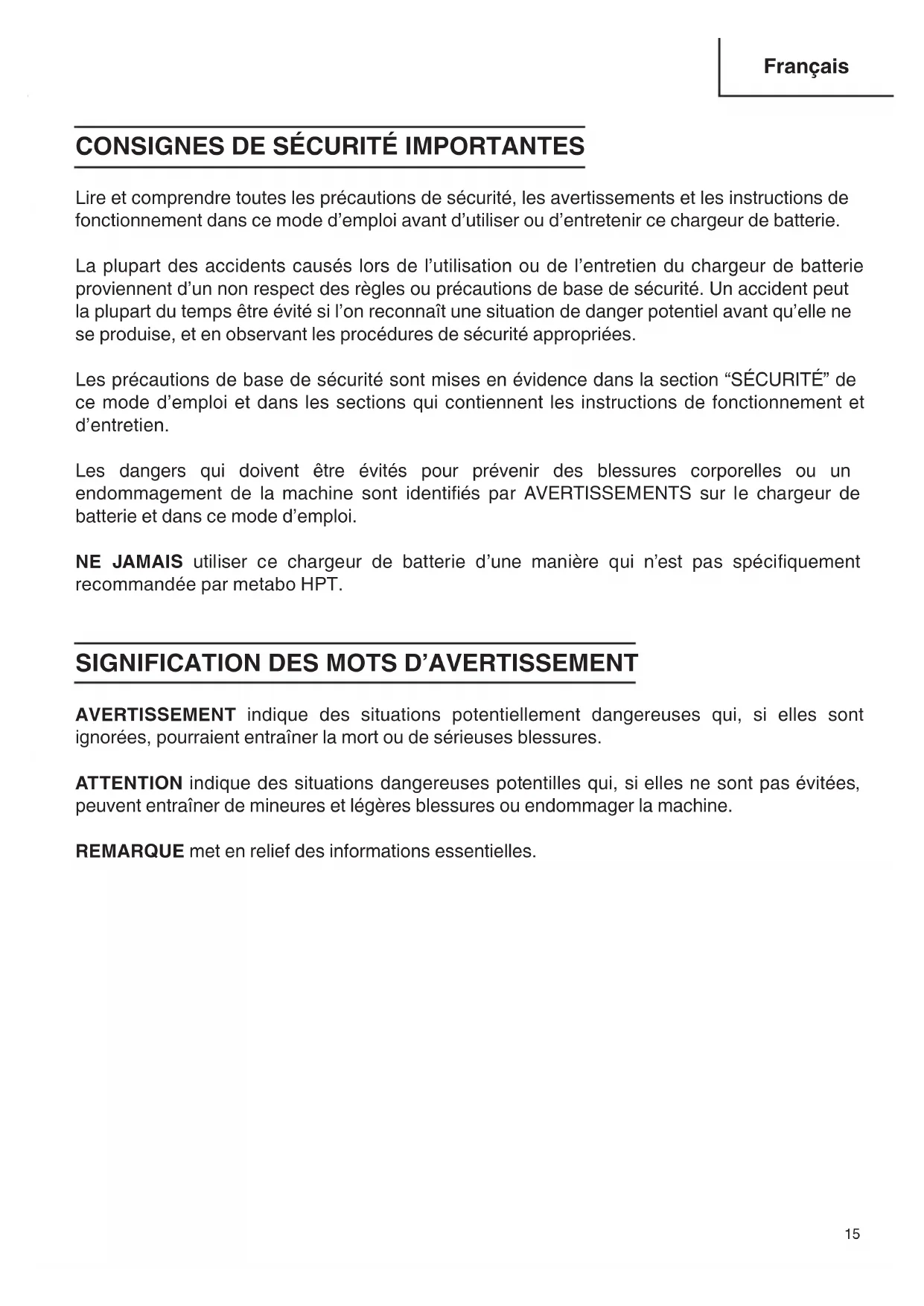 Lire et comprendre toutes les précautions de sécurité, les avertissements et les instructions de fonctionnement dans ce mode d’emploi avant d’utiliser ou d’entretenir ce chargeur de batterie. La plupart des accidents causés lors de l’utilisation ou de l’entretien du chargeur de batterie proviennent d’un non respect des règles ou précautions de base de sécurité. Un accident peut la plupart du temps être évité si l’on reconnaît une situation de danger potentiel avant qu’elle ne se produise, et en observant les procédures de sécurité appropriées. Les précautions de base de sécurité sont mises en évidence dans la section “SÉCURITÉ” de ce mode d’emploi et dans les sections qui contiennent les instructions de fonctionnement et d’entretien. Les dangers qui doivent être évités pour prévenir des blessures corporelles ou un endommagement de la machine sont identifi és par AVERTISSEMENTS sur le chargeur de batterie et dans ce mode d’emploi. NE JAMAIS utiliser ce chargeur de batterie d’une manière qui n’est pas spécifi quement recommandée par metabo HPT.