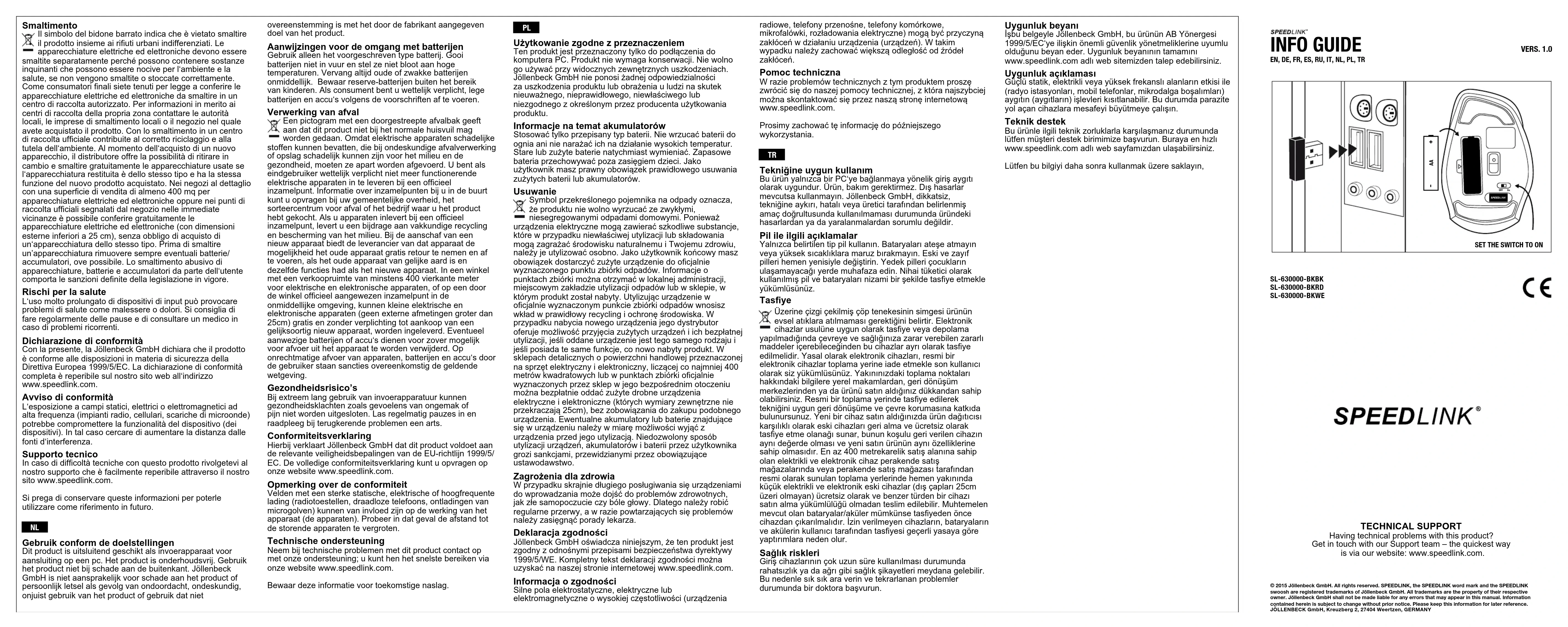 Utilisation conforme Ce produit est uniquement destiné à la recharge d‘appareils compatibles et à une utilisation dans des locaux fermés. Ce produit ne requiert pas d’entretien. Ne pas l’utiliser s’il présente des dommages extérieurs. La société Jöllenbeck GmbH décline toute responsabilité en cas de dommages sur des personnes, des animaux ou des biens dus à une utilisation du produit inconsidérée, incorrecte, erronée ou contraire aux instructions données par le fabricant. Remarques relatives aux piles Utilisez uniquement le type de piles prescrit. Ne pas jeter les piles au feu et ne pas les exposer à des températures élevées. Dès que les piles sont usées, elles doivent être remplacées. Conservez les piles de réserve hors de portée des enfants. En tant qu‘utilisateur, vous êtes tenu d’éliminer correctement les piles et accus usagés. Élimination Le symbole représentant une poubelle barrée signie que ce produit ne doit pas être placé avec les ordures ménagères. Les appareils électriques peuvent contenir des substances toxiques susceptibles de nuire à l’environnement et à votre santé en cas d’élimination ou de stockage incorrects et ils doivent donc être éliminés séparément. En tant que consommateur, vous êtes tenu par la loi de déposer les appareils électriques usagés dans une borne de collecte ofcielle. Pour connaître les bornes de collecte proches de chez vous, adressez-vous aux services de votre commune, aux décharges locales ou au magasin où vous avez acheté ce produit. En déposant vos appareils usagés dans une borne de collecte ofcielle, vous contribuez à garantir leur recyclage dans les règles de l’art et à protéger l’environnement. Lorsque vous achetez un nouvel appareil, son distributeur vous donne la possibilité de reprendre en échange votre ancien équipement et de l’éliminer gratuitement dans la mesure où l’équipement repris est de type équivalent et présente les mêmes fonctions que le nouveau produit acheté. Les petits appareils électriques et électroniques usagés (dont toutes les dimensions extérieures sont inférieures à 25 cm) peuvent être déposés gratuitement, et sans obligation d’acheter un équipement équivalent, dans les magasins de détail disposant d’une surface de vente consacrée aux équipements électriques et électroniques d’au moins 400 m² ou dans des bornes de collecte ofciellement indiquées par le magasin et situées dans les environs immédiats. Retirer dans la mesure du possible les accumulateurs et piles qui se trouvent dans les appareils avant leur élimination. L’élimination par les consommateurs d’appareils, de piles et d’accumulateurs de manière non autorisée entraîne des sanctions conformément à la législation en vigueur. Risques pour la santé L‘utilisation extrêmement prolongée de périphériques de saisie peut entraîner des troubles physiologiques, tels que des gênes ou des douleurs. Veillez à faire des pauses régulièrement et consultez un médecin en cas de problèmes récurrents. Déclaration de conformité La société Jöllenbeck GmbH déclare que ce produit est conforme aux directives de sécurité afférentes de la directive de l‘Union européenne 1999/5/CE. Vous pouvez demander à recevoir la déclaration de conformité complète en allant sur notre site Web à l’adresse www.speedlink.com. Indication de conformité La présence de champs statiques, électriques ou à haute fréquence intenses (installations radio, téléphones mobiles, décharges de micro-ondes) peut perturber le bon fonctionnement de l‘appareil (ou des appareils). Dans ce cas, essayez d‘éloigner les appareils à l’origine des perturbations. Assistance technique En cas de difcultés techniques concernant ce produit, veuillez vous adresser à notre service d‘assistance technique. Le moyen le plus rapide consiste à le contacter par le biais de notre site Web www.speedlink.com. Veuillez conserver ces informations an de pouvoir vous y référer ultérieurement.