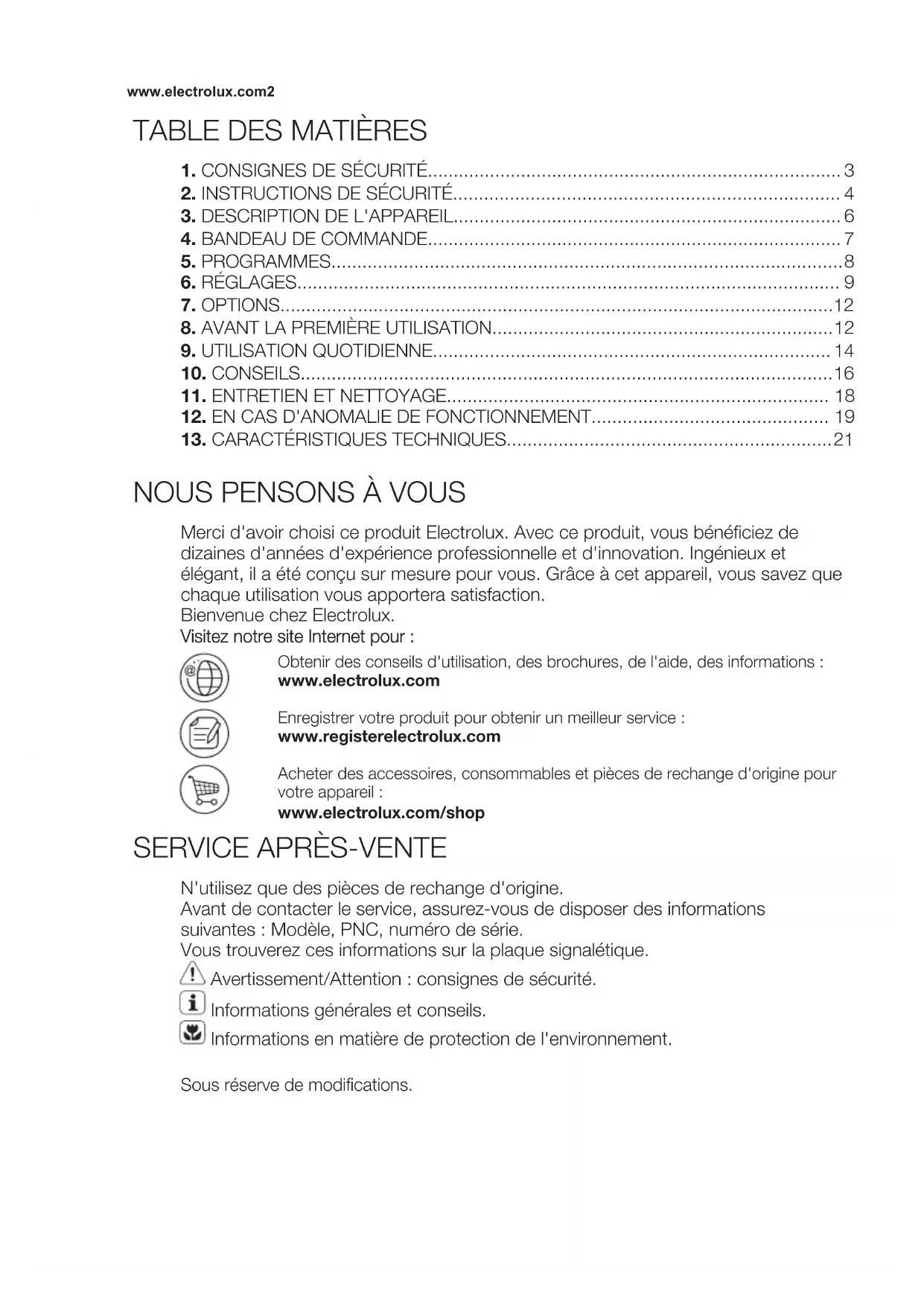 N'utilisez que des pièces de rechange d'origine. Avant de contacter le service, assurez-vous de disposer des informations suivantes : Modèle, PNC, numéro de série. Vous trouverez ces informations sur la plaque signalétique. Avertissement/Attention : consignes de sécurité. Informations générales et conseils. Informations en matière de protection de l'environnement. Sous réserve de modifications. www.electrolux.com21. CONSIGNES DE SÉCURITÉ Avant d'installer et d'utiliser cet appareil, lisez soigneusement les instructions fournies. Le fabricant ne peut être tenu pour responsable des dommages et blessures liés à une mauvaise installation ou utilisation. Conservez toujours cette notice avec votre appareil pour vous y référer ultérieurement.