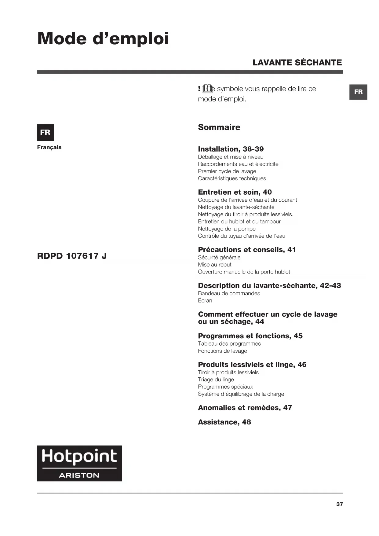 Français ! Ce symbole vous rappelle de lire ce mode d’emploi. Sommaire Installation, 38-39 Déballage et mise à niveau Raccordements eau et électricité Premier cycle de lavage Caractéristiques techniques Entretien et soin, 40 Coupure de l’arrivée d’eau et du courant Nettoyage du lavante-séchante Nettoyage du tiroir à produits lessiviels. Entretien du hublot et du tambour Nettoyage de la pompe Contrôle du tuyau d’arrivée de l’eau Précautions et conseils, 41 Sécurité générale Mise au rebut Ouverture manuelle de la porte hublot Description du lavante-séchante, 42-43 Bandeau de commandes Écran Comment effectuer un cycle de lavage ou un séchage, 44 Programmes et fonctions, 45 Tableau des programmes Fonctions de lavage Produits lessiviels et linge, 46 Tiroir à produits lessiviels Triage du linge Programmes spéciaux Système d’équilibrage de la charge Anomalies et remèdes, 47 Assistance, 48