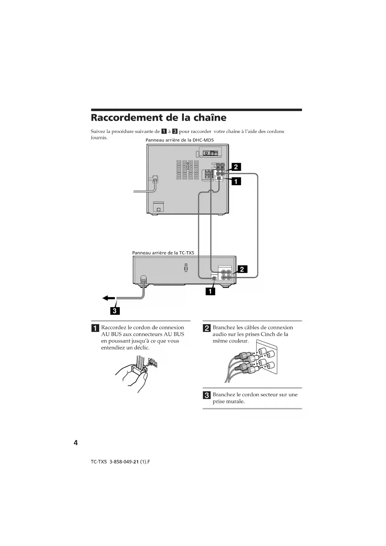 Raccordement de la chaîne Suivez la procédure suivante de 1 à 3 pour raccorder votre chaîne à l’aide des cordons fournis. Raccordez le cordon de connexion AU BUS aux connecteurs AU BUS en poussant jusqu’à ce que vous entendiez un déclic.
