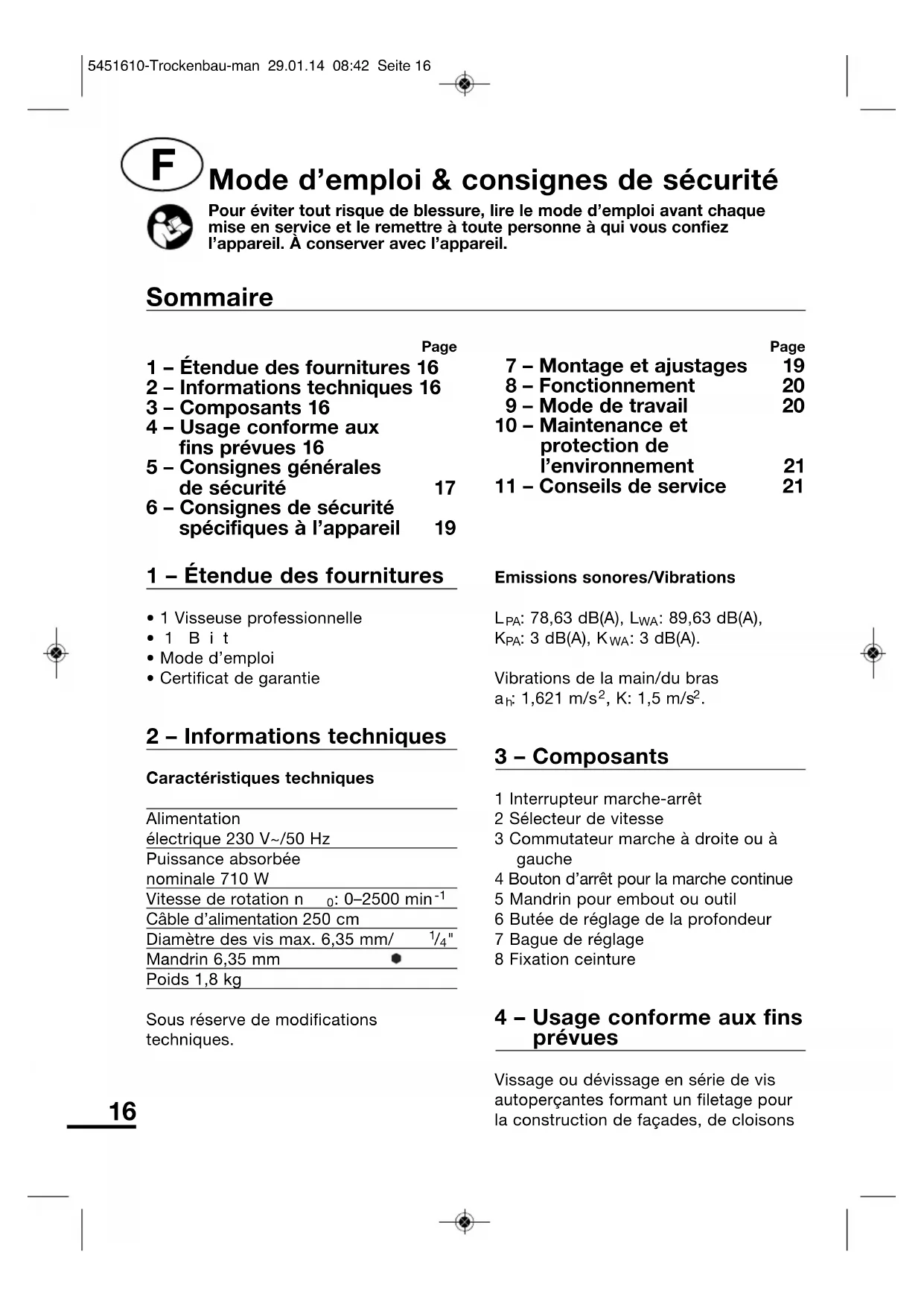 Page 1 – Étendue des fournitures 16 2 – Informations techniques 16 3 – Composants 16 4 – Usage conforme aux fins prévues 16 5 – Consignes générales de sécurité 17 6 – Consignes de sécurité spécifiques à l’appareil 19 Page 7 – Montage et ajustages 19 8 – Fonctionnement 20 9 – Mode de travail 20 10 – Maintenance et protection de l’environnement 21 11 – Conseils de service 21 Sommaire 5451610-Trockenbau-man 29.01.14 08:42 Seite 1617 ou de toitures, la menuiserie métallique ou la construction d’installations technologiques. Utilisez cette machine et ses accessoires dans son domaine d’application uniquement. Toute autre utilisation est expressément interdite. Cet appareil est uniquement destiné à un usage dans le domaine domestique. 5 – Consignes générales de sécurité pour l’utilisation d’outils électriques ATTENTION! Lire toutes les instructions de sécurité et toutes les indications. Le non-respect des instructions indiquées ci-après peut entraîner un choc électrique, un incendie et/ou de graves blessures. Conserver les instructions de sécurité et indications pour une utilisation ultérieure. La notion d’« outil électroportatif » mentionnée dans les avertissements se rapporte à des outils électriques raccordés au secteur (avec câble de raccordement) et à des outils électriques à accu (sans câble de raccordement). Endroit de travail