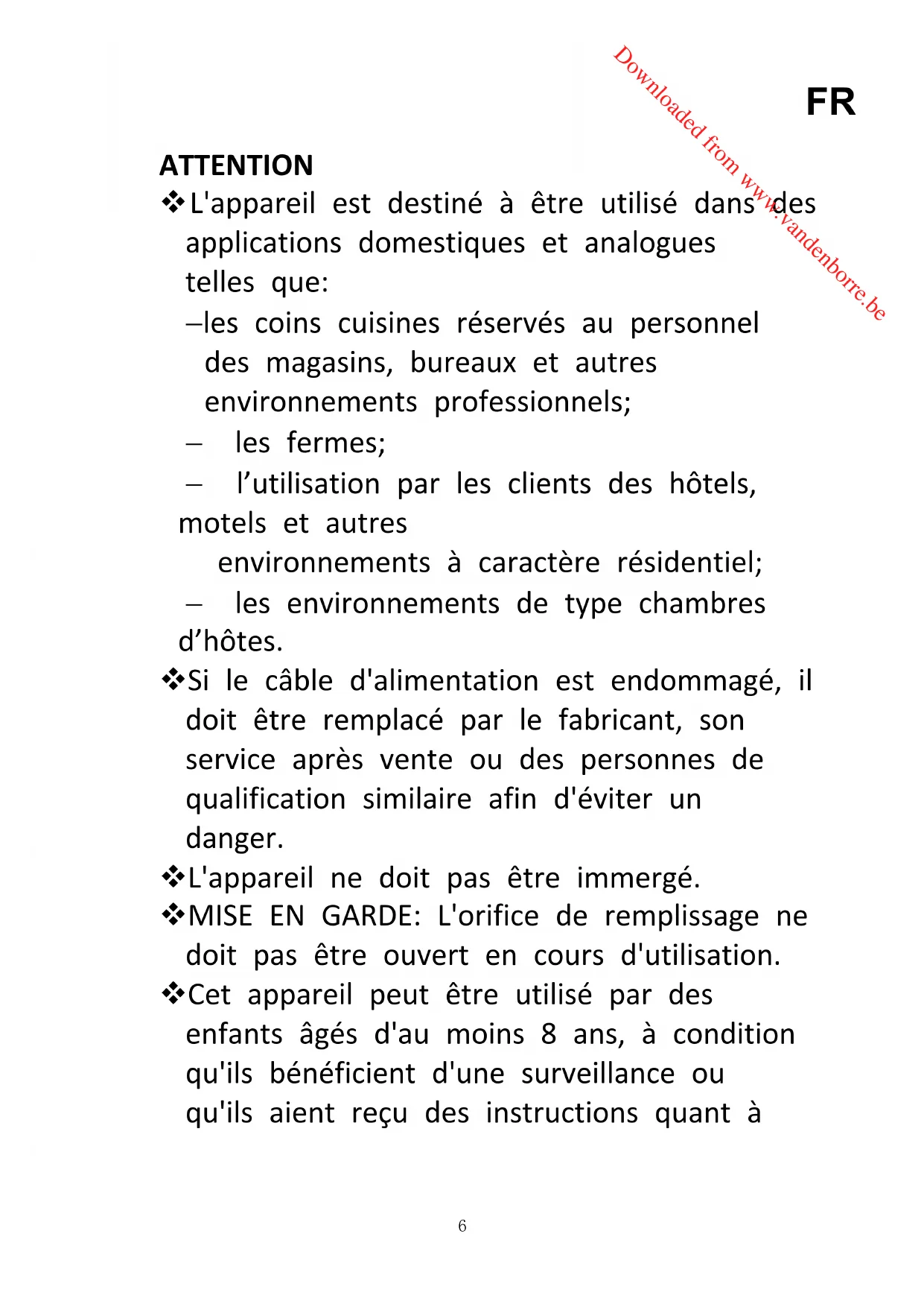 Downloaded from www.vandenborre.bel'utilisation de l'appareil en toute sécurité et qu'ils comprennent bien les dangers encourus. Le nettoyage et l'entretien par l'utilisateur ne doivent pas être effectués par des enfants, à moins qu'ils ne soient âgés de plus de 8 ans et qu'ils soient sous la surveillance d'un adulte. Conserver l'appareil et son câble hors de portée des enfants âgés de moins de 8 ans.