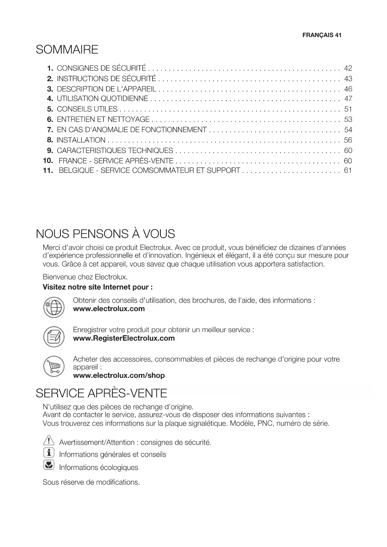 N'utilisez que des pièces de rechange d'origine. Avant de contacter le service, assurez-vous de disposer des informations suivantes : Vous trouverez ces informations sur la plaque signalétique. Modèle, PNC, numéro de série. Avertissement/Attention : consignes de sécurité. Informations générales et conseils Informations écologiques Sous réserve de modifications.