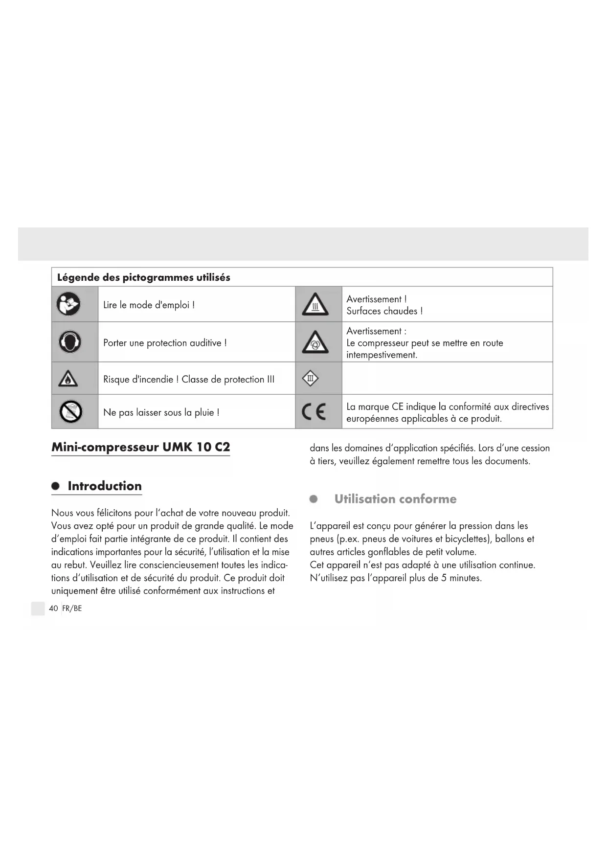 Le compresseur peut se mettre en route intempestivement. Risque d'incendie ! Classe de protection III Ne pas laisser sous la pluie ! La marque CE indique la conformité aux directives européennes applicables à ce produit. Mini-compresseur UMK 10 C2 Introduction Nous vous félicitons pour l‘achat de votre nouveau produit. Vous avez opté pour un produit de grande qualité. Le mode d‘emploi fait partie intégrante de ce produit. Il contient des indications importantes pour la sécurité, l’utilisation et la mise au rebut. Veuillez lire consciencieusement toutes les indica- tions d‘utilisation et de sécurité du produit. Ce produit doit uniquement être utilisé conformément aux instructions et dans les domaines d‘application spécifiés. Lors d‘une cession à tiers, veuillez également remettre tous les documents. Utilisation conforme L‘appareil est conçu pour générer la pression dans les pneus (p.ex. pneus de voitures et bicyclettes), ballons et autres articles gonflables de petit volume. Cet appareil n‘est pas adapté à une utilisation continue. N‘utilisez pas l‘appareil plus de 5 minutes. 383683_2110_V3.0_uls_Mini-Kompressor UMK 10 C2_Content_OS.indd 40 21.01.22 09:4141 FR/BE Toute autre utilisation peut conduire à un endommagement de l‘appareil et représenter de graves dangers pour l‘utilisateur. Le fabricant n’endosse aucune responsabilité en cas de dom- mages causés par une manipulation non conforme ou par une utilisation erronée de l’appareil. Ce produit n‘est pas destiné à l‘usage professionnel. La garantie est annulée en cas d‘utilisation commerciale. Contenu de la livraison/Accessoires Déballez l‘appareil et vérifiez s‘il est complet : 1 mini compresseur 4 adaptateurs de soupape 1 notice d‘utilisation Éliminez les matériaux d‘emballage de manière appropriée. Vue d‘ensemble