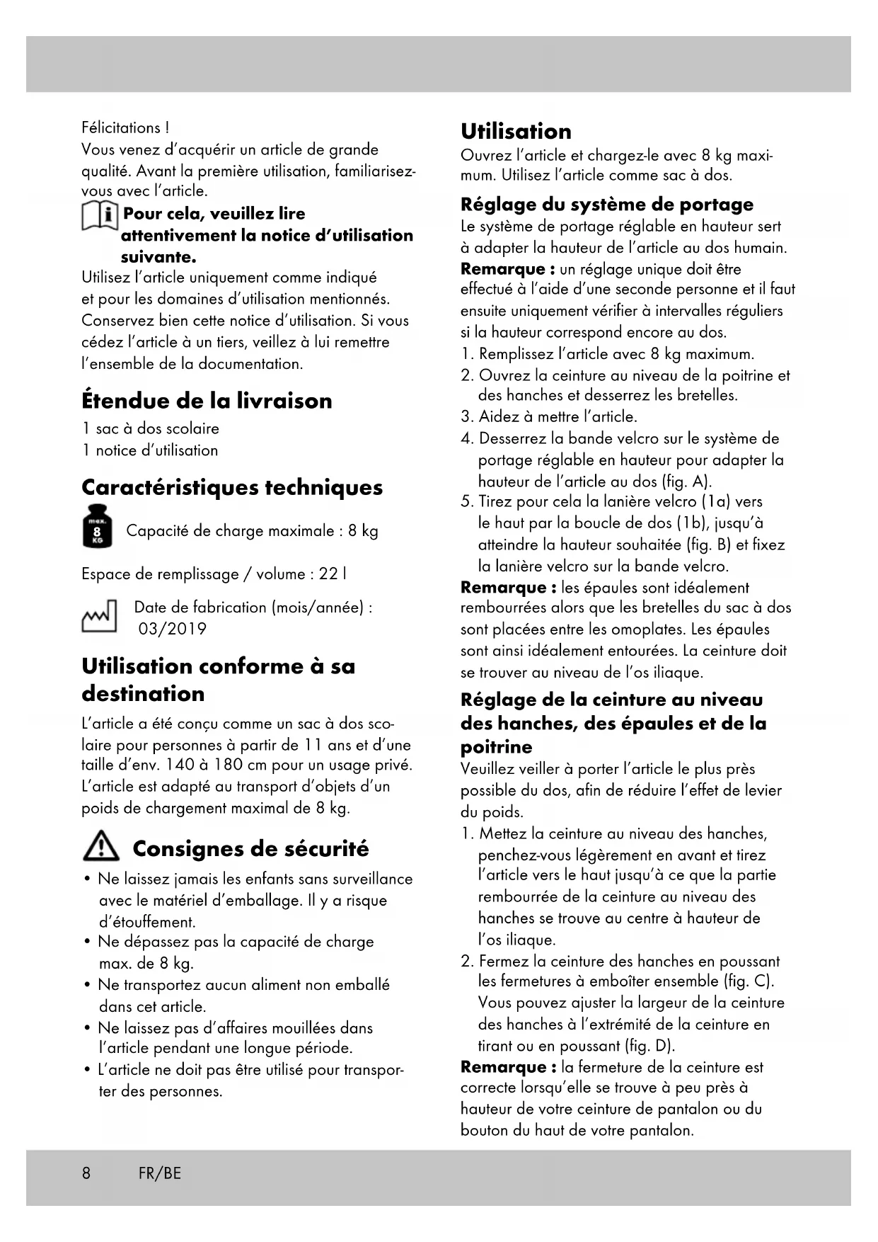 Capacité de charge maximale : 8 kg Espace de remplissage / volume : 22 l Date de fabrication (mois/année) : 03/2019 Utilisation conforme à sa destination L’article a été conçu comme un sac à dos sco- laire pour personnes à partir de 11 ans et d’une taille d’env. 140 à 180 cm pour un usage privé. L’article est adapté au transport d’objets d’un poids de chargement maximal de 8 kg. Consignes de sécurité