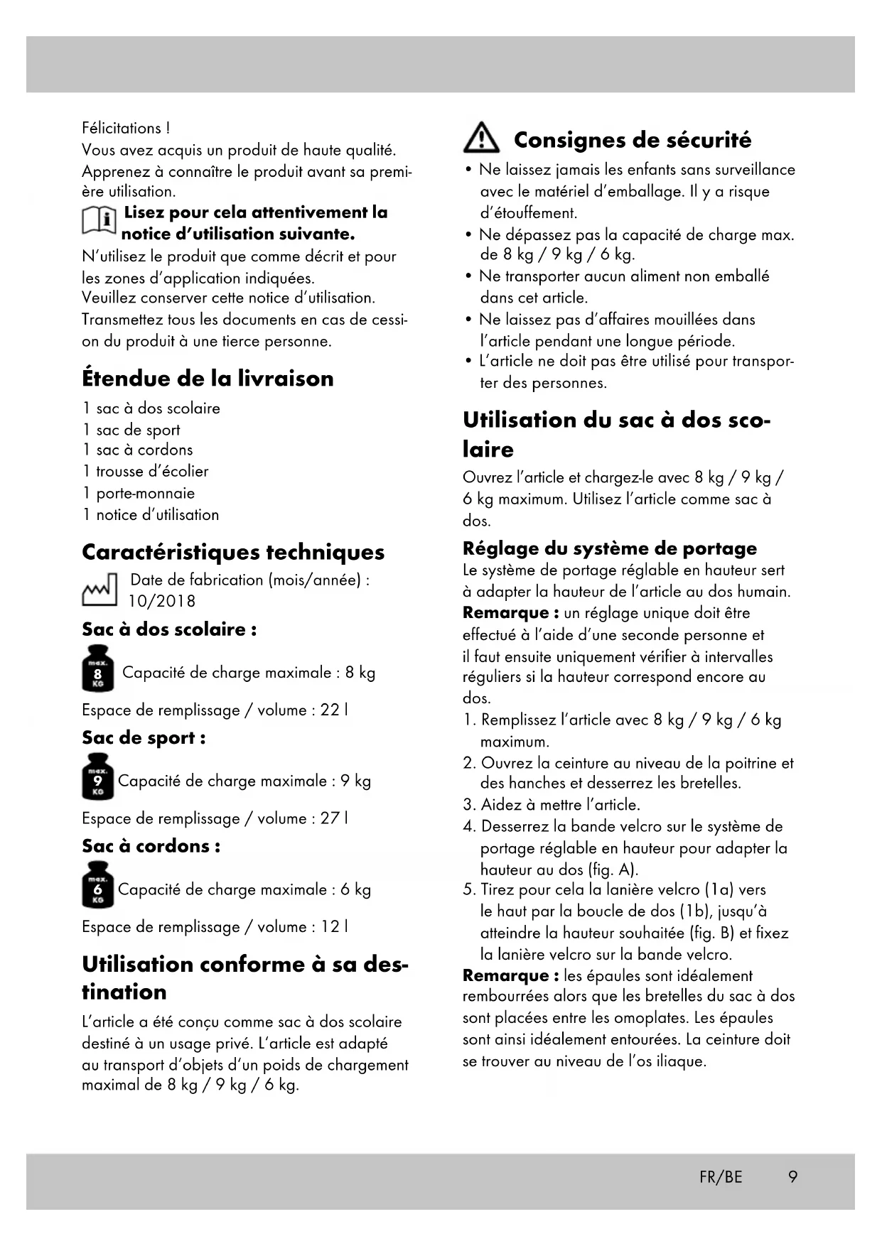 - L’article ne doit pas être utilisé pour transpor- ter des personnes. Utilisation du sac à dos sco- laire Ouvrez l’article et chargez-le avec 8 kg / 9 kg / 6 kg maximum. Utilisez l’article comme sac à dos. Réglage du système de portage Le système de portage réglable en hauteur sert à adapter la hauteur de l’article au dos humain. Remarque : un réglage unique doit être effectué à l’aide d’une seconde personne et il faut ensuite uniquement vérifier à intervalles réguliers si la hauteur correspond encore au dos.