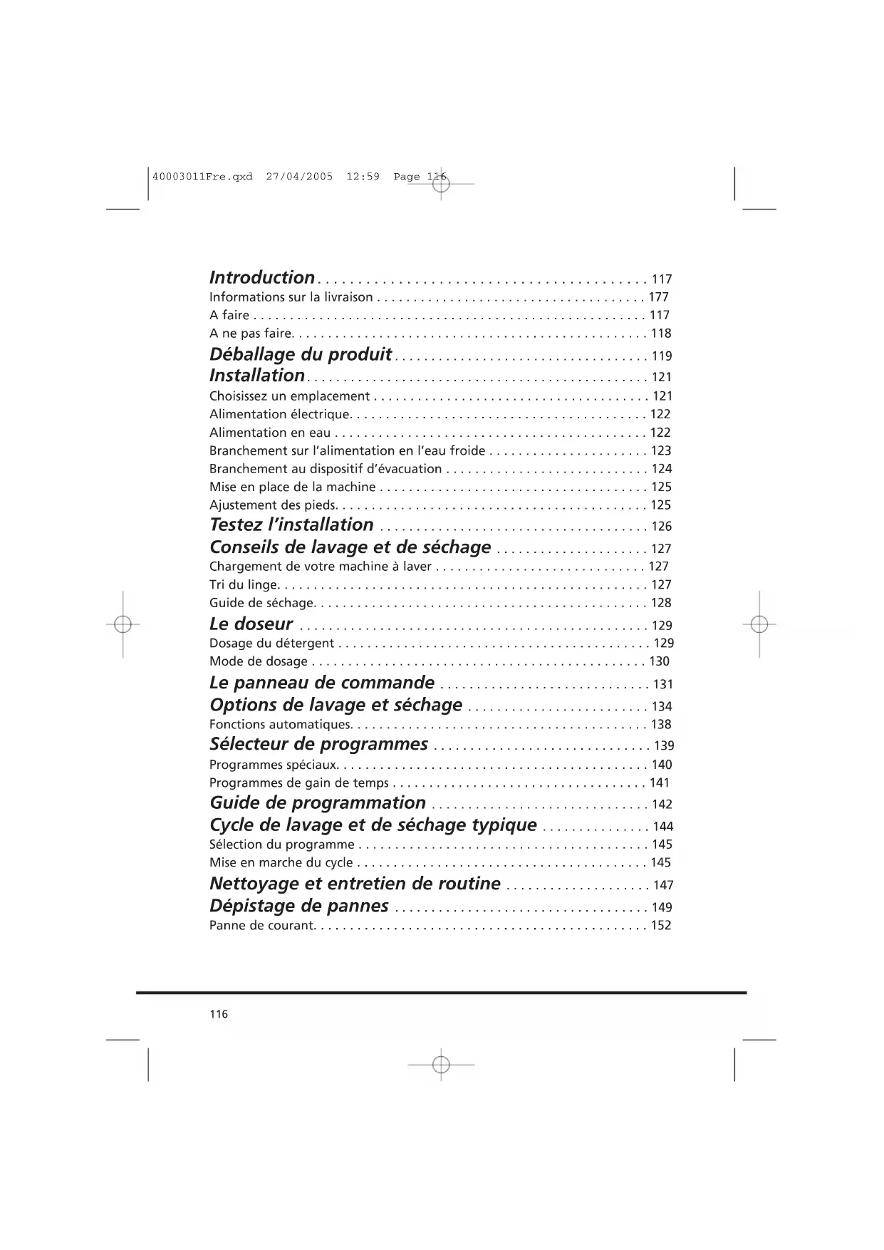 40003011Fre.qxd 27/04/2005 12:59 Page 116Introduction Veuillez lire et suivre ces instructions avec soin et utiliser la machine en conséquence. Ce livret contient des instructions importantes sur la sécurité d’utilisation, l’installation et l’entretien de la machine, ainsi que des conseils utiles pour obtenir les meilleurs résultats possibles lors de son utilisation. Conservez toute la documentation dans un endroit sûr pour pouvoir vous y reporter à une date ultérieure ou la transmettre aux prochains propriétaires. Informations sur la livraison Vérifiez que les articles suivants ont bien été livrés avec l’appareil : ● Manuel d’utilisation ● Carte de garantie ● Bonde ● Tuyau d’admission et crochet de support du tuyau (voir la section Déballage et installation) ● Panneau inférieur et 2 fixations à poussoir ● Étiquette d’énergie A faire ● Tous les matériaux de conditionnement utilisés sont écologiques et recyclables. Veuillez les éliminer de manière écologique. Votre municipalité pourra vous donner le détail exact des méthodes d’élimination en vigueur. ● Pour assurer la sécurité lors de l’élimination d’une vieille machine à laver, veuillez débrancher la fiche du courant de secteur, couper le câble d’alimentation et le détruire avec la fiche. Pour empêcher que les enfants ne s’enferment dans la machine, cassez les charnières de la porte ou son dispositif de verrouillage. ● Cette machine est conçue uniquement pour usage domestique, soit pour laver, rincer et essorer le linge domestique et les vêtements.