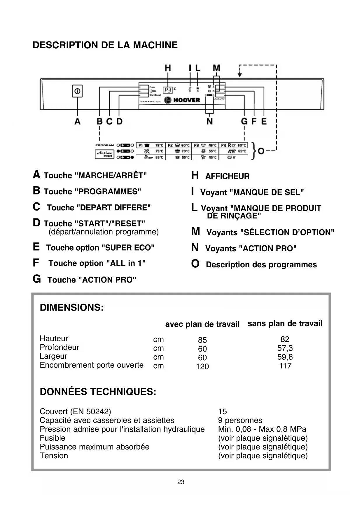 9 personnes Min. 0,08 - Max 0,8 MPa (voir plaque signalétique) (voir plaque signalétique) (voir plaque signalétique) DONNÉES TECHNIQUES: DIMENSIONS: Hauteur Profondeur Largeur Encombrement porte ouverte