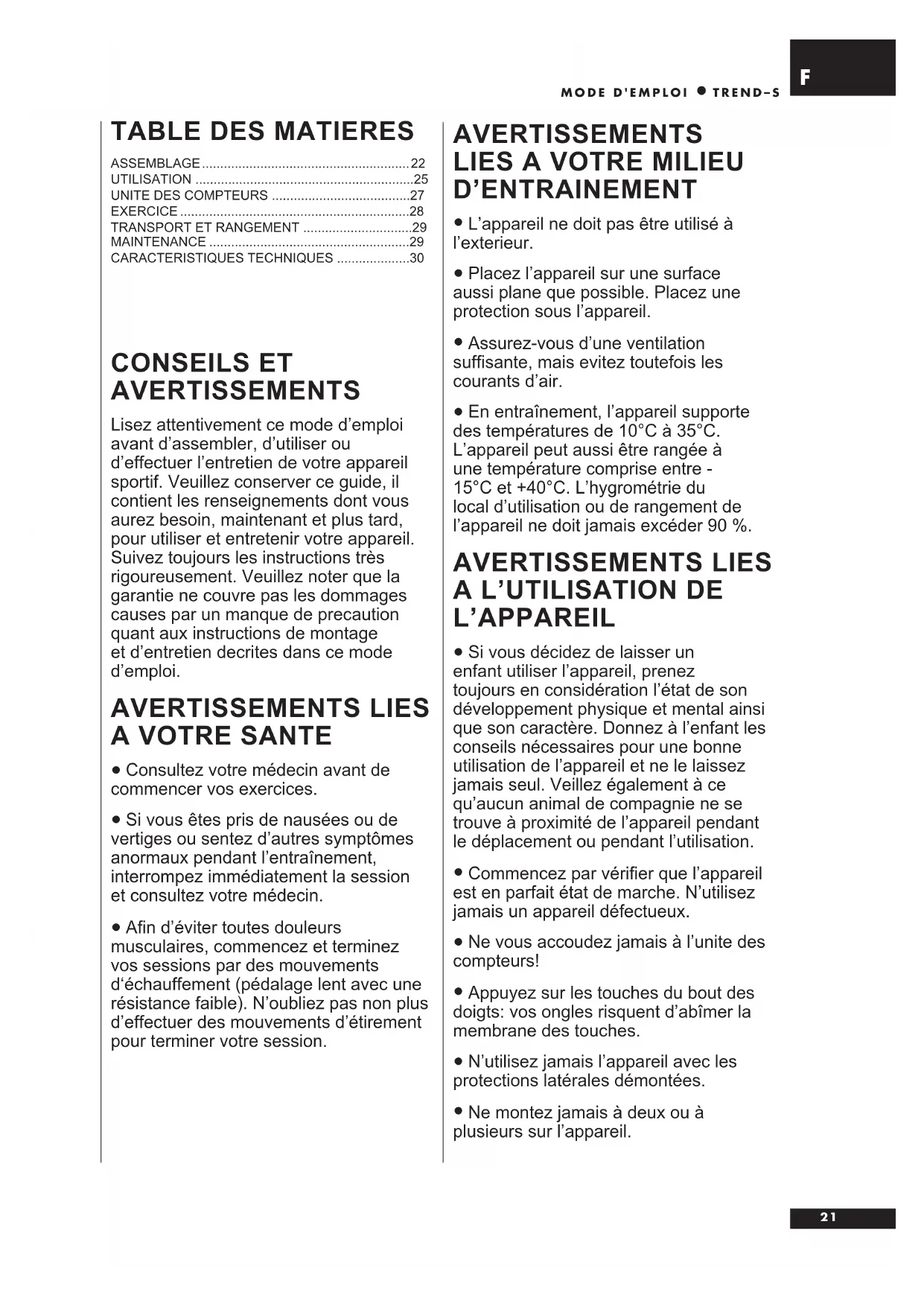 MODE D'EMPLOI TREND–S CONSEILS ET AVERTISSEMENTS Lisez attentivement ce mode d’emploi avant d’assembler, d’utiliser ou d’effectuer l’entretien de votre appareil sportif. Veuillez conserver ce guide, il contient les renseignements dont vous aurez besoin, maintenant et plus tard, pour utiliser et entretenir votre appareil. Suivez toujours les instructions très rigoureusement. Veuillez noter que la garantie ne couvre pas les dommages causes par un manque de precaution quant aux instructions de montage et d’entretien decrites dans ce mode d’emploi. AVERTISSEMENTS LIES