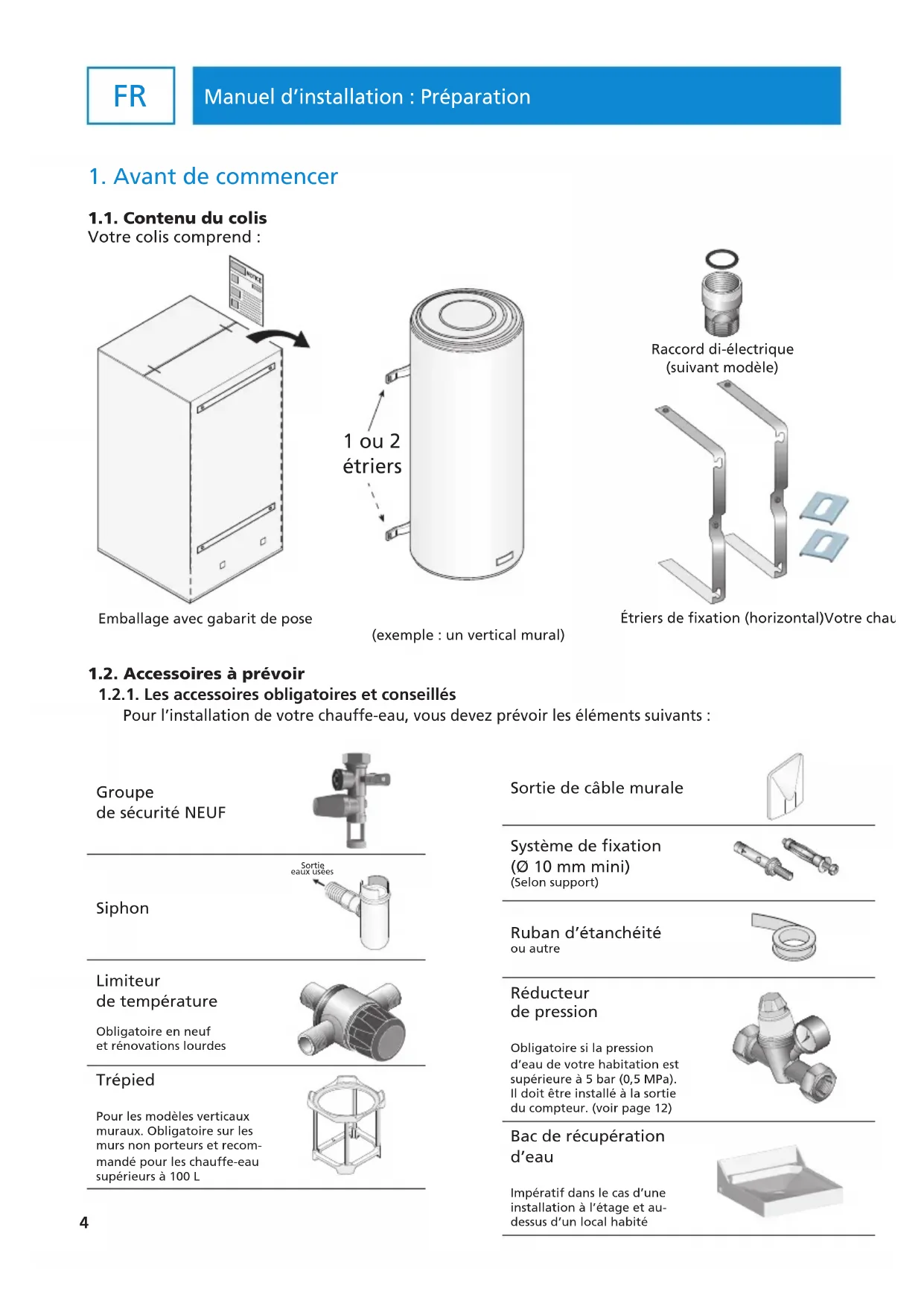 1.1. Contenu du colisVotre colis comprend :1.2. Accessoires à prévoir 1.2.1. Les accessoires obligatoires et conseillés Pour l’installation de votre chauffe-eau, vous devez prévoir les éléments suivants :Groupe de sécurité NEUFSiphonLimiteur de température Obligatoire en neuf et rénovations lourdesTrépied Pour les modèles verticaux muraux. Obligatoire sur les murs non porteurs et recom-mandé pour les chauffe-eau supérieurs à 100 L Emballage avec gabarit de pose Raccord di-électrique Kit de cerclage (selon modèle) 1 ou 2 étriers Votre chauffe-eau (exemple : un vertical mural) Emballage avec gabarit de poseRaccord di-électrique(suivant modèle)Étriers de xation (horizontal)Votre chauffe-eau(exemple : un vertical mural)Sortieeaux usées