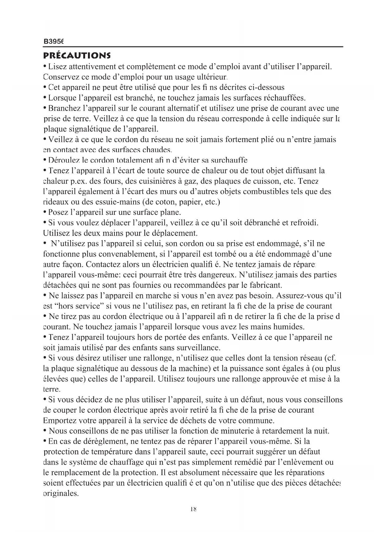 En cas de dérèglement, ne tentez pas de réparer l’appareil vous-même. Si la protection de température dans l’appareil saute, ceci pourrait suggérer un défaut dans le système de chauffage qui n’est pas simplement remédié par l’enlèvement ou le remplacement de la protection. Il est absolument nécessaire que les réparations soient effectuées par un électricien qualifi é et qu’on n’utilise que des pièces détachées originales. 18B3956