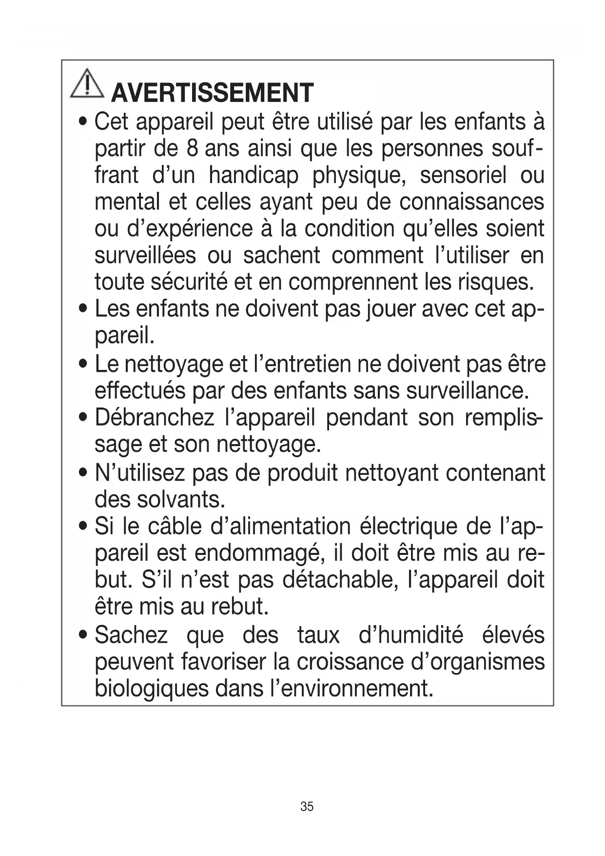 - Cet appareil peut être utilisé par les enfants à partir de 8 ans ainsi que les personnes souffrant d'un handicap physique, sensoriel ou mental et celles ayant peu de connaissances ou d'expérience à la condition qu'elles soient surveillées ou sachent comment l'utiliser en toute sécurité et en complément des risques.