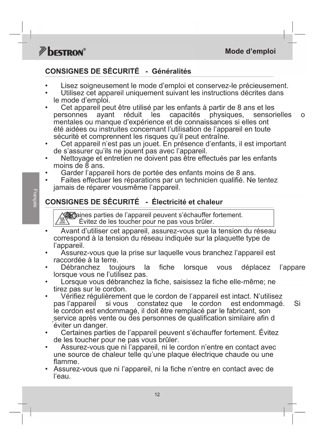 remplacementoularéparationdepiècesdéfectueuses.L’importateurnepeutêtretenuresponsable d’aucun dommage indirect, ni d’aucune conséquence quelle qu’elle soit, causé par ou ayant un quelconquerapportavecl’appareilqu’ilafourni. 10.Pourpouvoirfaireappelàlagarantie,vouspouvezvousadresseràvotrerevendeur.Bestronoffreaussi lapossibilitédefaireréparerl’appareil directementparleserviceaprès-ventede Bestron.Toutefois, n’envoyezjamaisriensansavoirreçud’instructionsaupréalable.Lecolispourraiteneffetêtrerefusé et les frais éventuels seraient à votre charge. Prenez contact avec le service après-vente qui vous expliqueracommentvousdevezemballeretexpédierl’appareil. 11.L’appareiln’estpasdestinéàl’usageprofessionnel. MAINTENANCE Si,parmalheur,unepanneseproduisait,veuillezcontacterleservicedemaintenancedeBESTRON: www.bestron.com/service