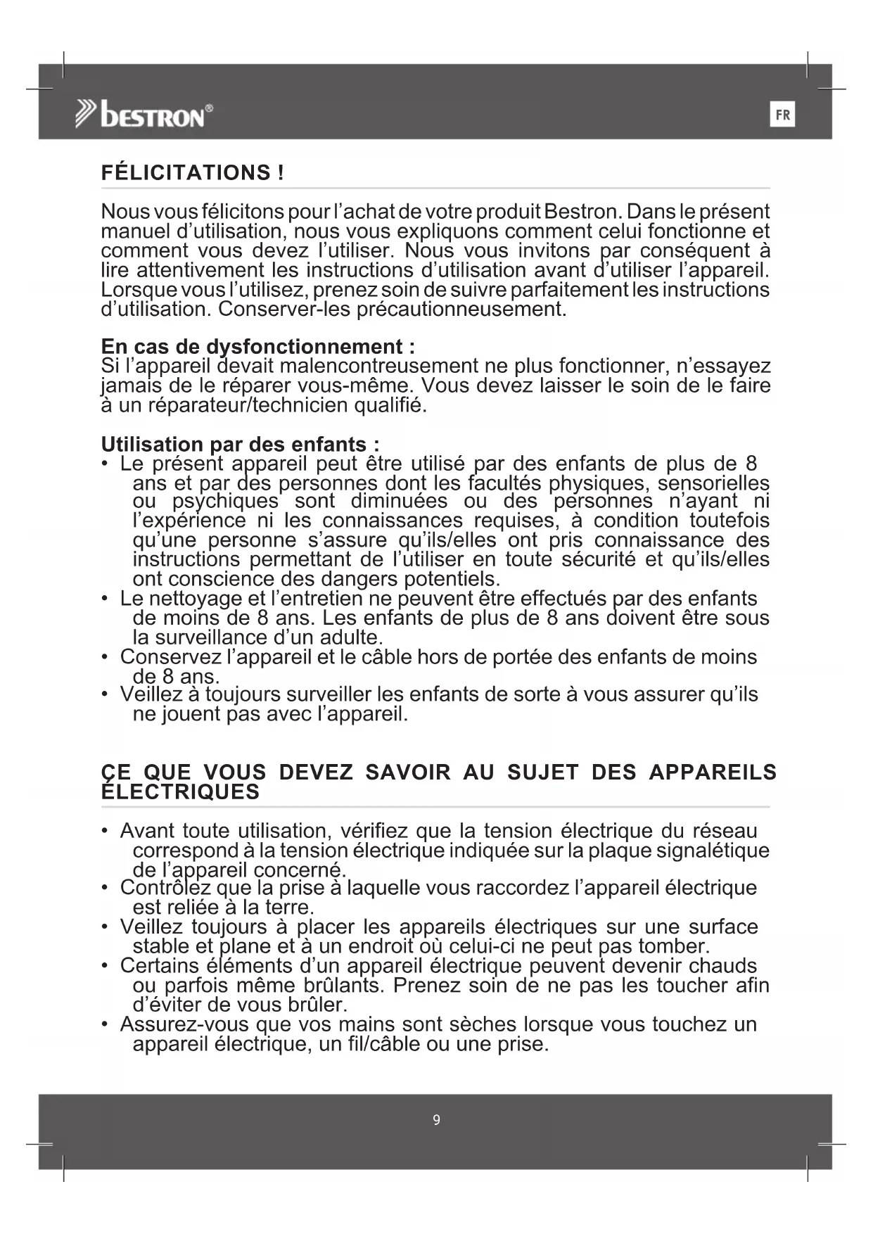 FÉLICITATIONS ! Nous vous félicitons pour l’achat de votre produit Bestron. Dans le présent manuel d’utilisation, nous vous expliquons comment celui fonctionne et comment vous devez l’utiliser. Nous vous invitons par conséquent à lire attentivement les instructions d’utilisation avant d’utiliser l’appareil. Lorsque vous l’utilisez, prenez soin de suivre parfaitement les instructions d’utilisation. Conserver-les précautionneusement. En cas de dysfonctionnement : Si l’appareil devait malencontreusement ne plus fonctionner, n’essayez jamais de le réparer vous-même. Vous devez laisser le soin de le faire à un réparateur/technicien qualifié. Utilisation par des enfants :