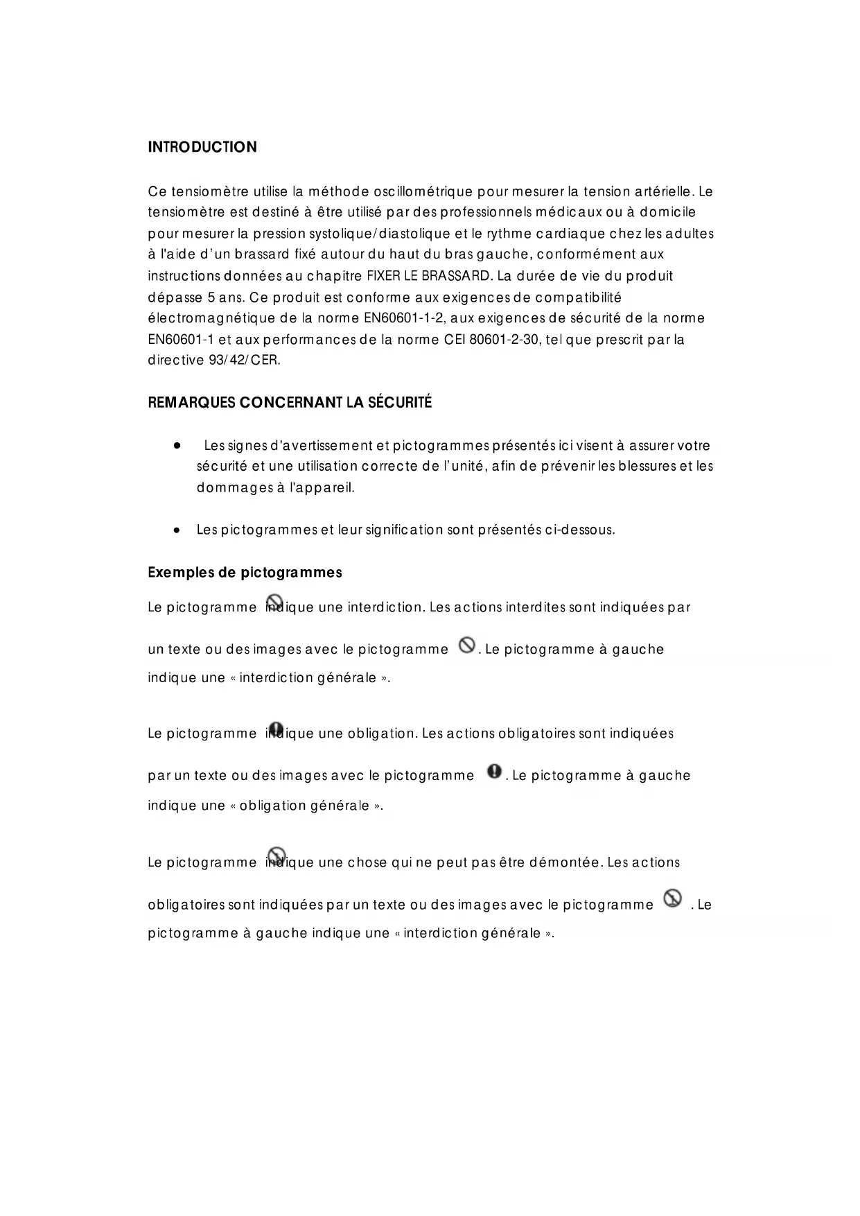 CARACTÉRISTIQUES DÉPANNAGEINTRODUCTION Ce tensiomètre utilise la méthode oscillométrique pour mesurer la tension artérielle. Le tensiomètre est destiné à être utilisé par des professionnels médicaux ou à domicile pour mesurer la pression systolique/diastolique et le rythme cardiaque chez les adultes à l'aide d’un brassard fixé autour du haut du bras gauche, conformément aux instructions données au chapitre FIXER LE BRASSARD. La durée de vie du produit dépasse 5 ans. Ce produit est conforme aux exigences de compatibilité électromagnétique de la norme EN60601-1-2, aux exigences de sécurité de la norme EN60601-1 et aux performances de la norme CEI 80601-2-30, tel que prescrit par la directive 93/42/CER.
