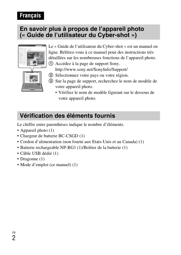 : Intelligent Auto : Sweep Panorama : Movie Mode W/T (Zoom) Français En savoir plus à propos de l’appareil photo (« Guide de l’utilisateur du Cyber-shot ») Le « Guide de l’utilisateur du Cyber-shot » est un manuel en ligne. Référez-vous à ce manuel pour des instructions très détaillées sur les nombreuses fonctions de l’appareil photo. 1 Accédez à la page de support Sony. http://www.sony.net/SonyInfo/Support/ 2 Sélectionnez votre pays ou votre région. 3 Sur la page de support, recherchez le nom de modèle de votre appareil photo.