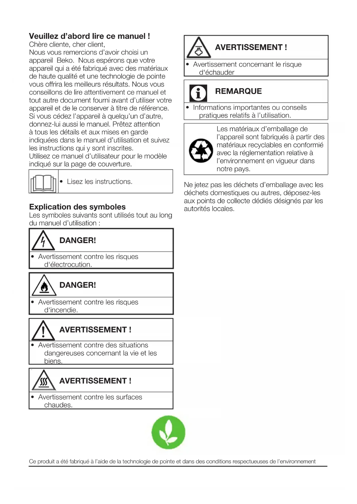 Wasdroger/ Gebruiker manuel25 Sèche-linge / Manuel de l’utilisateur Ce produit a été fabriqué à l’aide de la technologie de pointe et dans des conditions respectueuses de l’environnement Veuillez d’abord lire ce manuel ! Chère cliente, cher client, Nous vous remercions d’avoir choisi un appareil Beko. Nous espérons que votre appareil qui a été fabriqué avec des matériaux de haute qualité et une technologie de pointe vous offrira les meilleurs résultats. Nous vous conseillons de lire attentivement ce manuel et tout autre document fourni avant d’utiliser votre appareil et de le conserver à titre de référence. Si vous cédez l’appareil à quelqu’un d’autre, donnez-lui aussi le manuel. Prêtez attention à tous les détails et aux mises en garde indiquées dans le manuel d’utilisation et suivez les instructions qui y sont inscrites. Utilisez ce manuel d’utilisateur pour le modèle indiqué sur la page de couverture.
