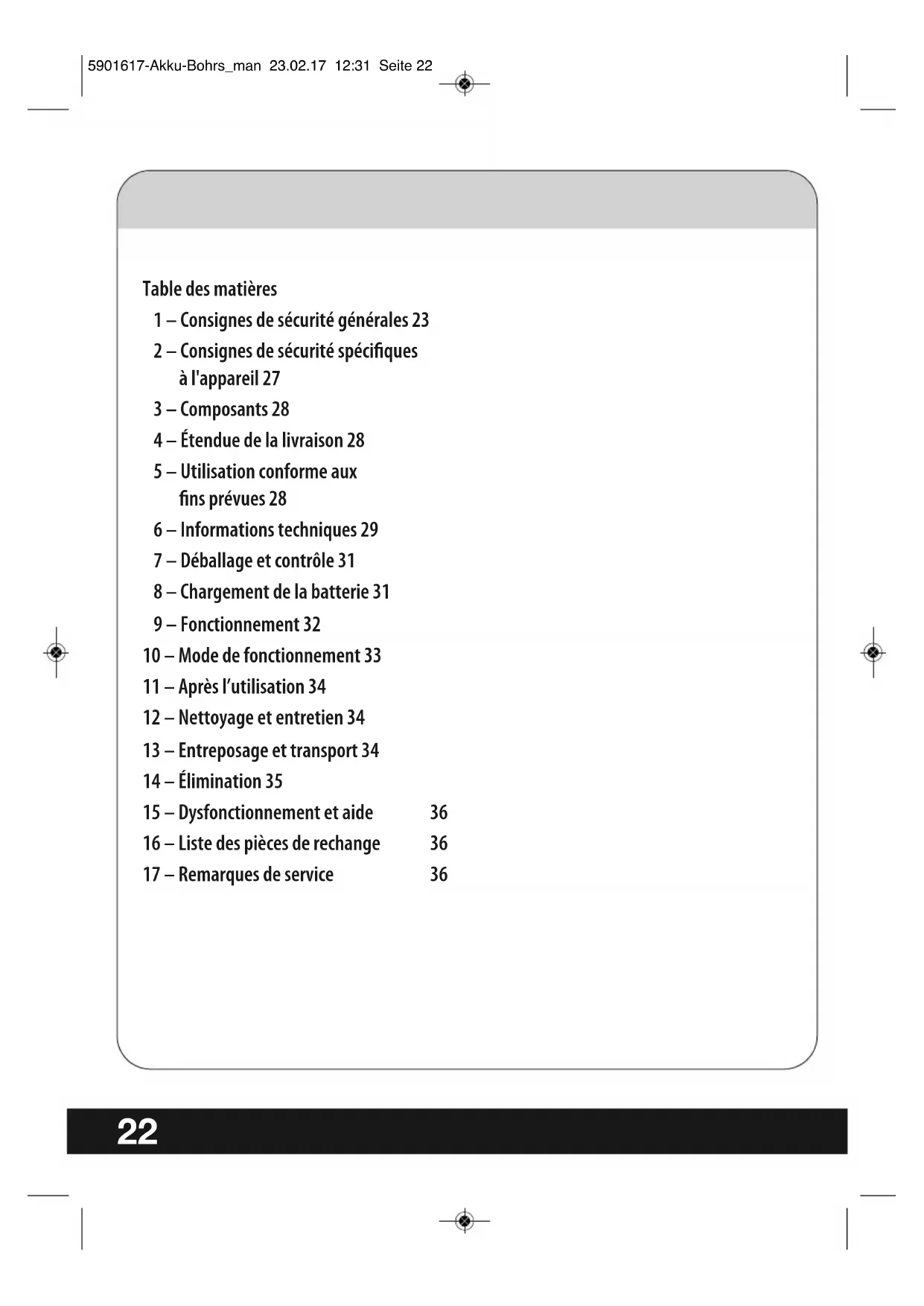 - Bestimmte Teile dieses Gerätes stehen bis 06/2020 zur Verfügung. 5901617-Akku-Bohrs_man 23.02.17 12:31 Seite 2122 Table des matières 1 – Consignes de sécurité générales 23 2 – Consignes de sécurité spécifiques à l'appareil 27 3 – Composants 28 4 – Étendue de la livraison 28 5 – Utilisation conforme aux fins prévues 28 6 – Informations techniques 29 7 – Déballage et contrôle 31 8 – Chargement de la batterie 31 9 – Fonctionnement 32 10 – Mode de fonctionnement 33 11 – Après l’utilisation 34 12 – Nettoyage et entretien 34 13 – Entreposage et transport 34 14 – Élimination 35 15 – Dysfonctionnement et aide 36 16 – Liste des pièces de rechange 36 17 – Remarques de service 36 5901617-Akku-Bohrs_man 23.02.17 12:31 Seite 221 – Consignes de sécurité générales pour l'utilisation d'outils électriques AVERTISSEMENT ! Lisez toutes les consignes de sécurité et toutes les instructions. La négligence du respect des consignes de sécurité et des instructions peut causer un choc électrique, un incendie et/ou des blessures graves. Veuillez conserver toutes les consignes de sécurité et instructions pour consultation ultérieure. Le terme « outil électrique » utilisé dans les consignes de sécurité désigne les outils électriques fonctionnant sur secteur (avec câble secteur) et les outils électriques à batterie (sans câble secteur). 1 Sécurité sur le lieu de travail a Veillez à ce que votre poste de travail soit toujours propre et bien éclairé. Un poste de travail mal rangé ou mal éclairé peut entrainer des accidents. b Ne travaillez pas avec l'outil électrique dans un environnement présentant des risques d'explosion, dans lequel se trouvent des liquides, des gaz ou des poussières inflammables. Les outils électriques engendrent des étincelles pouvant mettre le feu aux poussières ou aux vapeurs. c Lors de l'utilisation de l’outil électrique, ne laissez ni les enfants ni d'autres personnes s'approcher. Si votre attention est détournée, vous pouvez perdre le contrôle de l'appareil. 2 Sécurité électrique a La fiche de l'outil électrique doit être adaptée à la prise secteur. Elle ne doit en aucun cas être modifiée. N'utilisez pas d'adaptateurs de prise sur un outil électrique mis à la terre. L’utilisation de fiches intactes et de prises secteurs adaptées diminue les risques de décharges électriques. b Évitez tout contact corporel avec les surfaces mises à la terre comme les tuyaux, les chauffages, les cuisinières et les réfrigérateurs. Le risque de décharge électrique est plus élevé quand votre corps est relié à la terre. c Protégez l'appareil de la pluie et de l'humidité. La présence d’eau dans l'appareil électrique augmente les risques de choc électrique. d N'utilisez pas le câble pour porter ou suspendre l'outil électrique ni pour débrancher la prise secteur. Protégez le câble de la chaleur, de l'huile, des rebords coupants ou des éléments mobiles de l'appareil. Des câbles abîmés ou enroulés augmentent les risques de décharge électrique. e Si vous travaillez dehors avec l'outil électrique, n'utilisez que des rallonges autorisées pour l'extérieur. L'utilisation d'une rallonge adaptée au travail en extérieur diminue les risques de décharges électriques. f S'il est impossible d'éviter d'utiliser l'outil électrique dans un environnement humide, utilisez alors un disjoncteur différentiel. Il permet de diminuer les risques de décharges électriques. 3 Sécurité des personnes a Soyez attentifs, faites attention à ce que vous faites et soyez raisonnable lorsque vous travaillez avec un outil électrique.